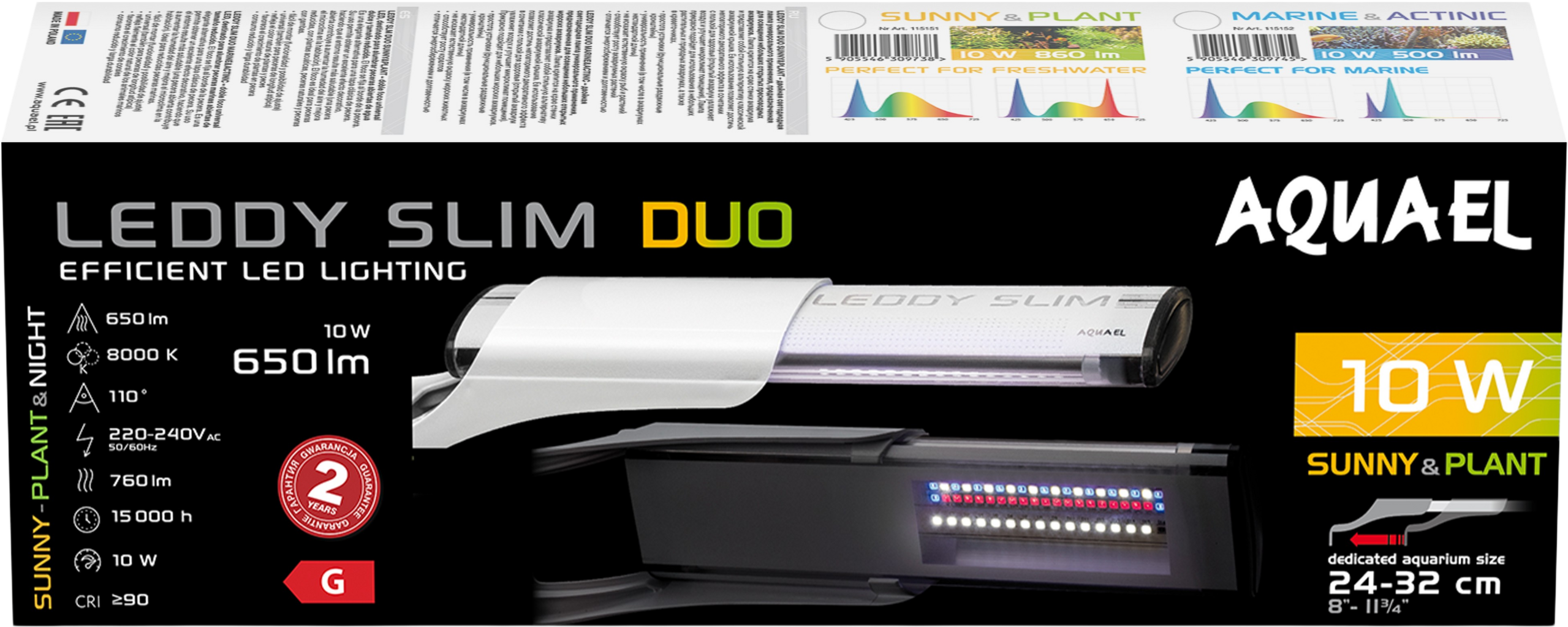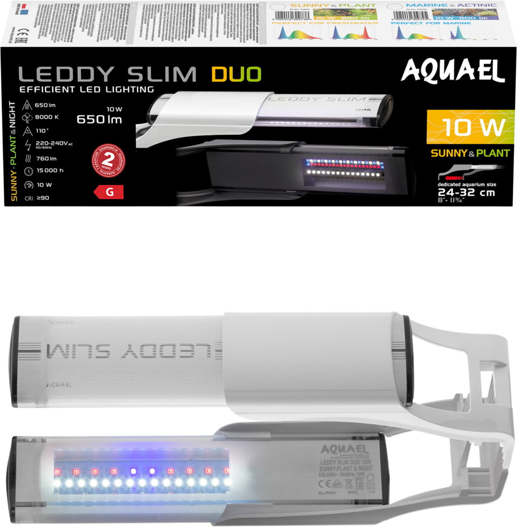 Leddy Slim Duo Sunny Plant & Night е модерно осветление за вашия отворен сладководен аквариум. То се състои от два реда диоди с обща мощност 10 W, половината от които са слънчеви диоди, наподобяващи слънчева светлина и с цветна температура 7000 K.