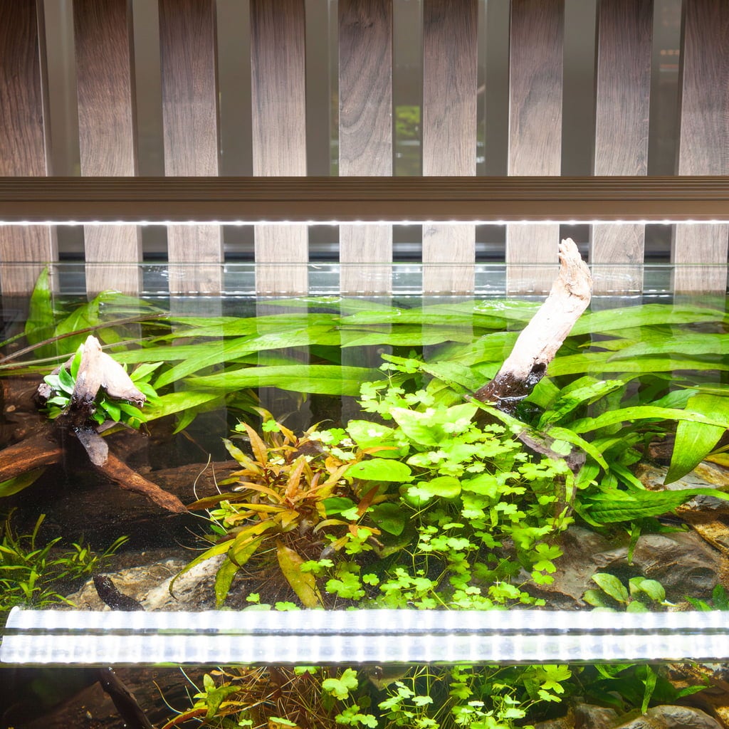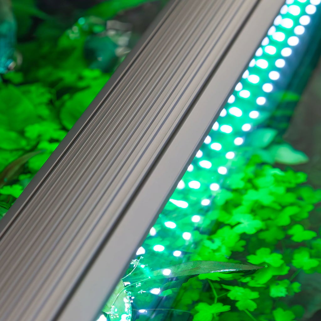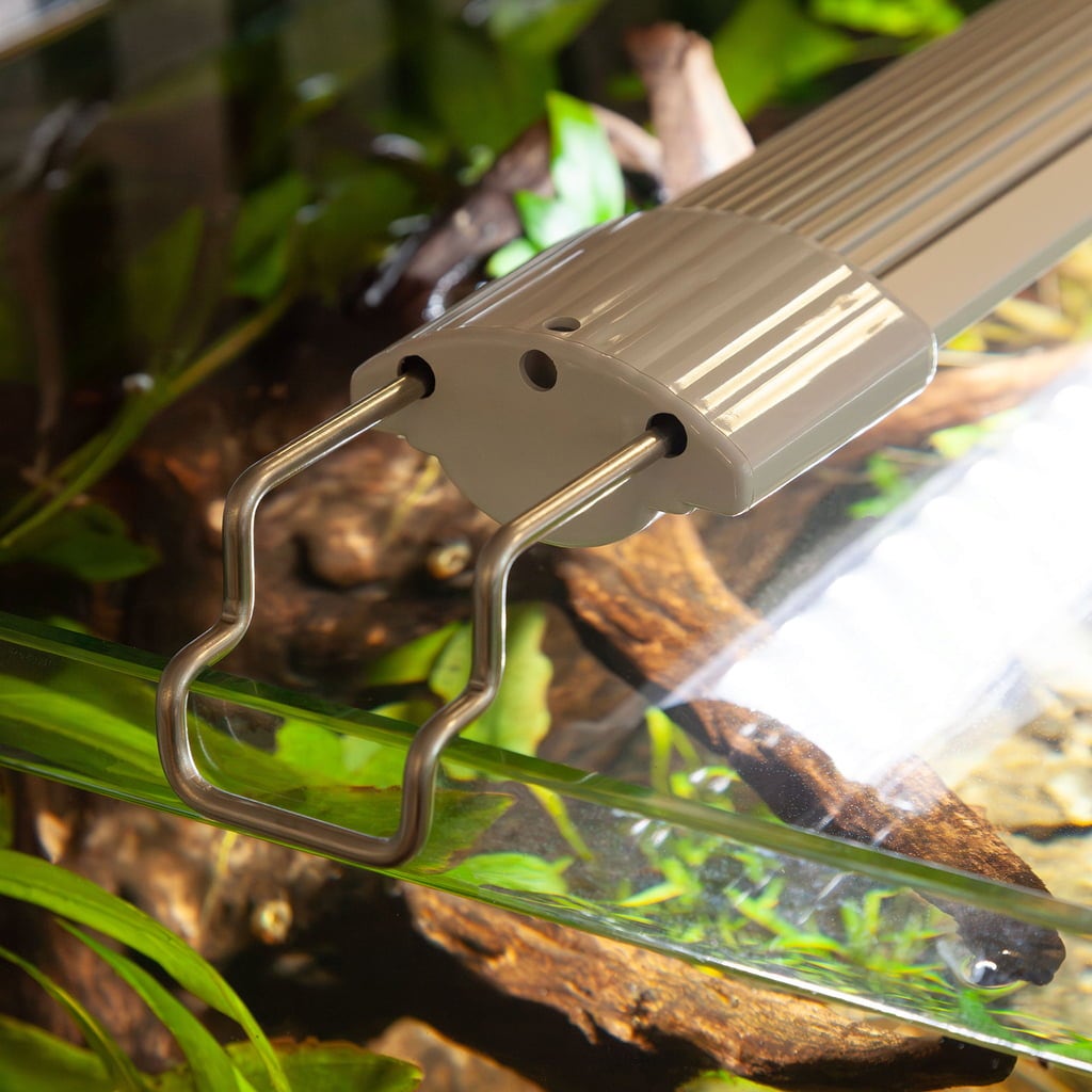 Усъвършенстваната алуминиева конструкция с вградени охлаждащи ребра осигурява оптимално разсейване на топлината и е специално проектирана за взискателните условия в аквариумите. Прозрачното акрилно стъкло увеличава максимално пропускането на светлината и по този начин подобрява ефективността на осветлението. Благодарение на регулируемите метални скоби в двата края LED осветлението може да бъде гъвкаво адаптирано към всеки аквариум.