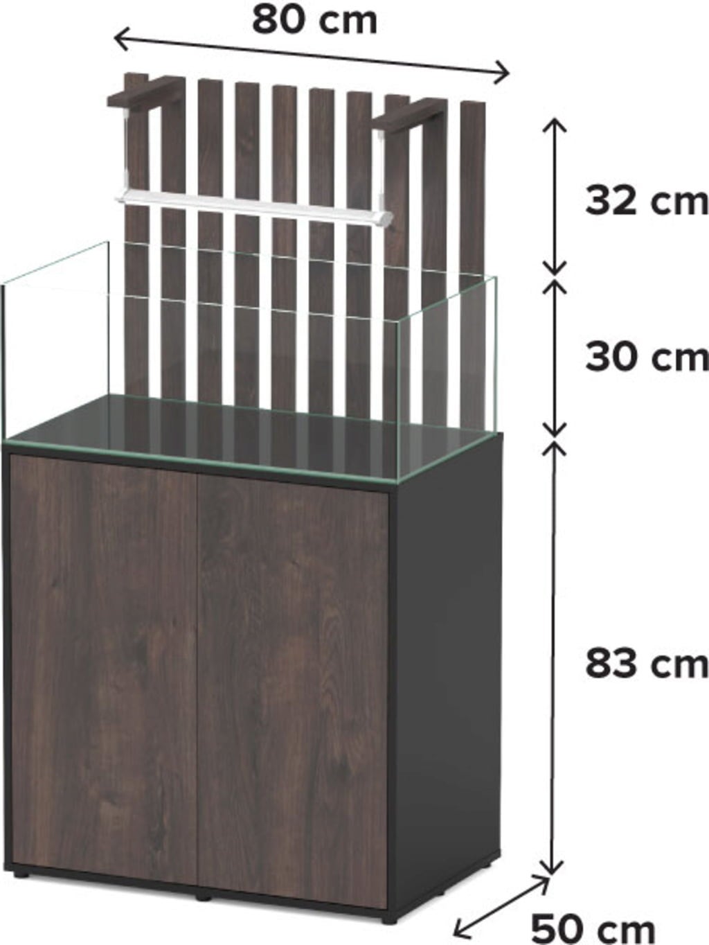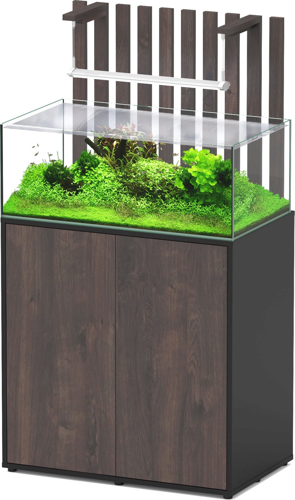 Основният шкаф с двойни врати е изработен от висококачествени материали, включително елегантни дървени ламели на гърба. Шкафът предлага много място за съхранение на храна за риби, инструменти и аксесоари, така че всичко да е на една ръка разстояние, когато ви е необходимо. Вратите с плавно затваряне се отварят и затварят с плавно и безшумно движение, а шкафът е снабден с LED осветление отвътре.