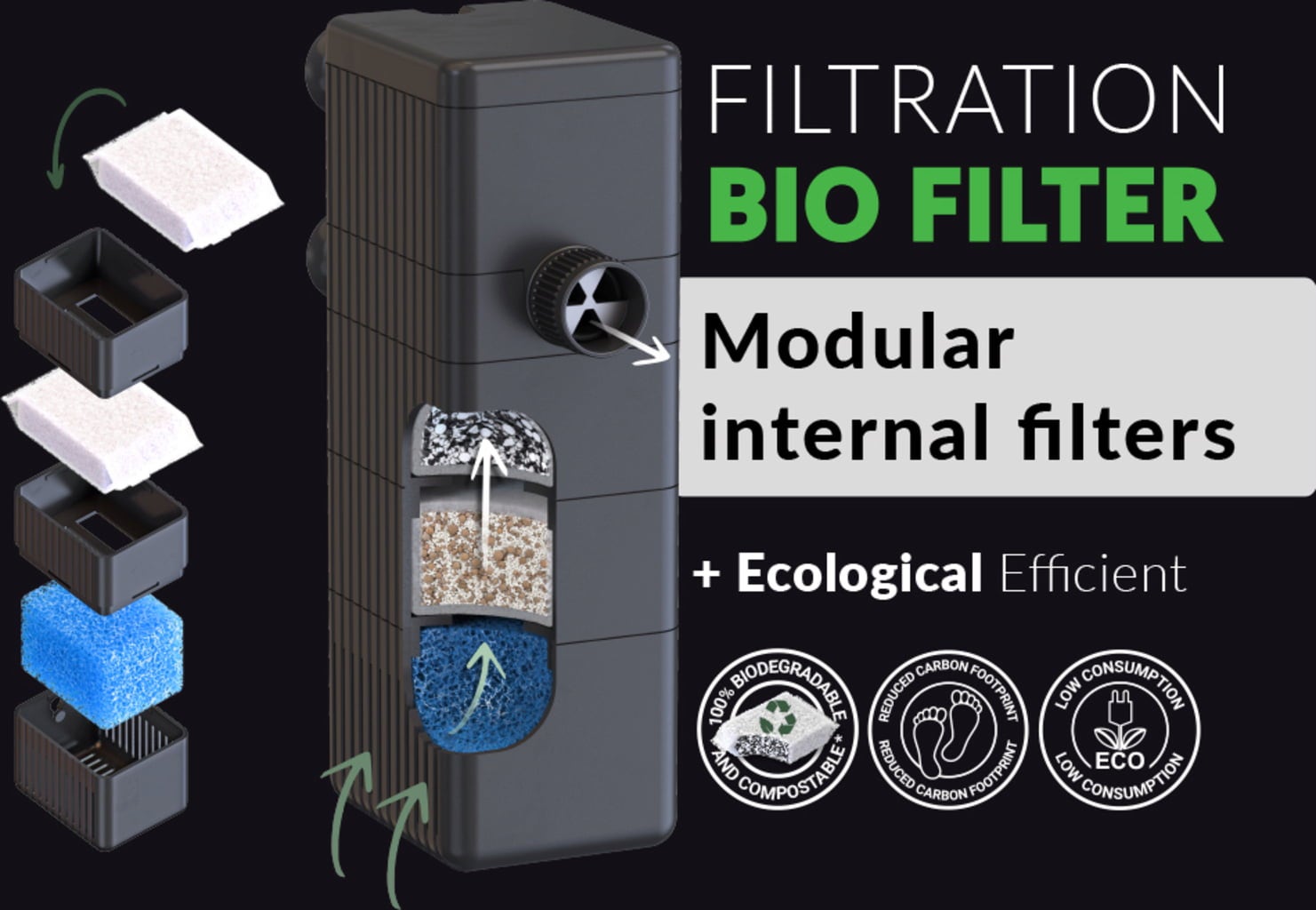 Биофилтърът, който също е включен в комплекта, осигурява вътрешна филтрация и е особено тих и мощен. Той съдържа биологични, химични и механични филтърни материали, които се поставят модулно в системата от филтърни касети и осигуряват оптимална филтърна ефективност. В зависимост от вида, филтърните материали са биоразградими, а някои от тях могат да се използват и като растителен субстрат след употреба.