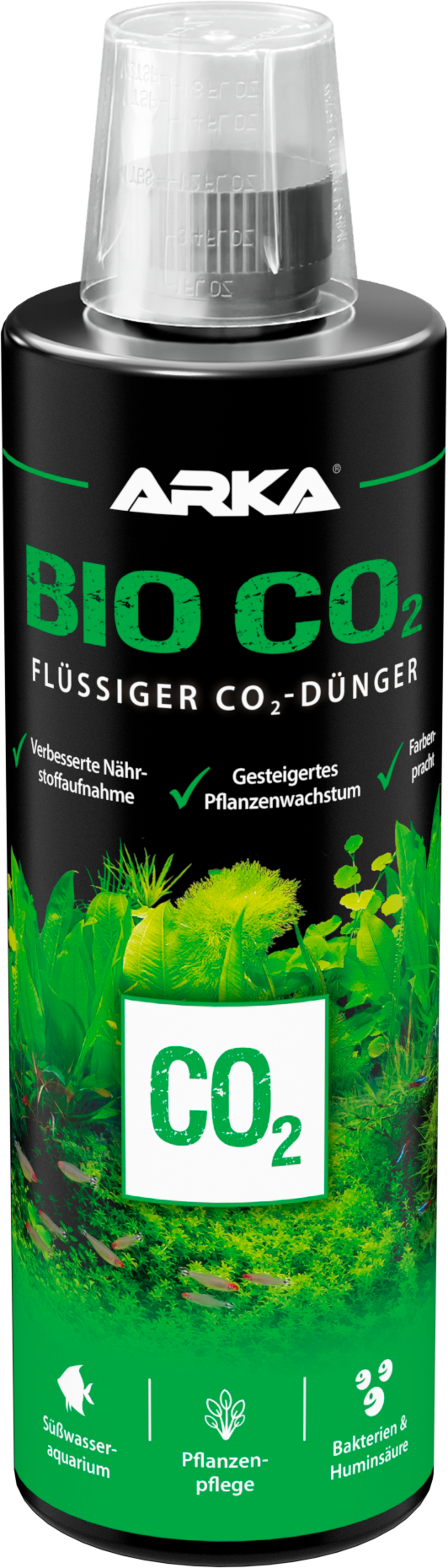 Като източник на микробен въглерод, Bio CO2 подпомага растежа и здравето на растенията в сладководните аквариуми. Естествената хуминова киселина и полезните бактерии подпомагат усвояването и използването на важни хранителни вещества. Продуктът насърчава здравословния и енергичен растеж на водните растения, осигурява интензивни цветове и предотвратява растежа на водораслите.