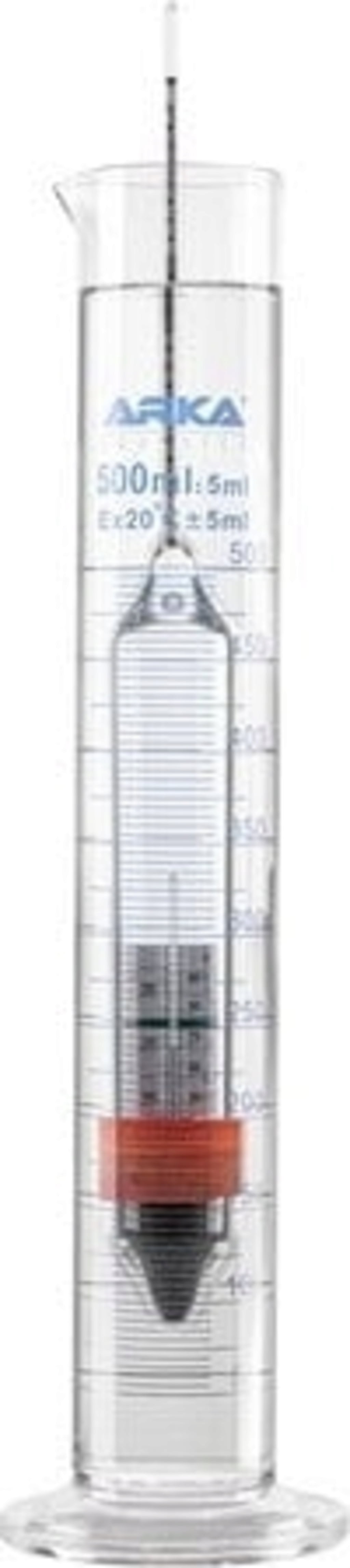 В комплекта е включен и измервателен цилиндър, изработен от здраво боросиликатно стъкло 3.3. Той е подходящ за лабораторна употреба и е с вместимост 500 ml. Цилиндърът разполага с достатъчно място за хидрометъра и ви позволява да извършвате свободни и точни измервания.
