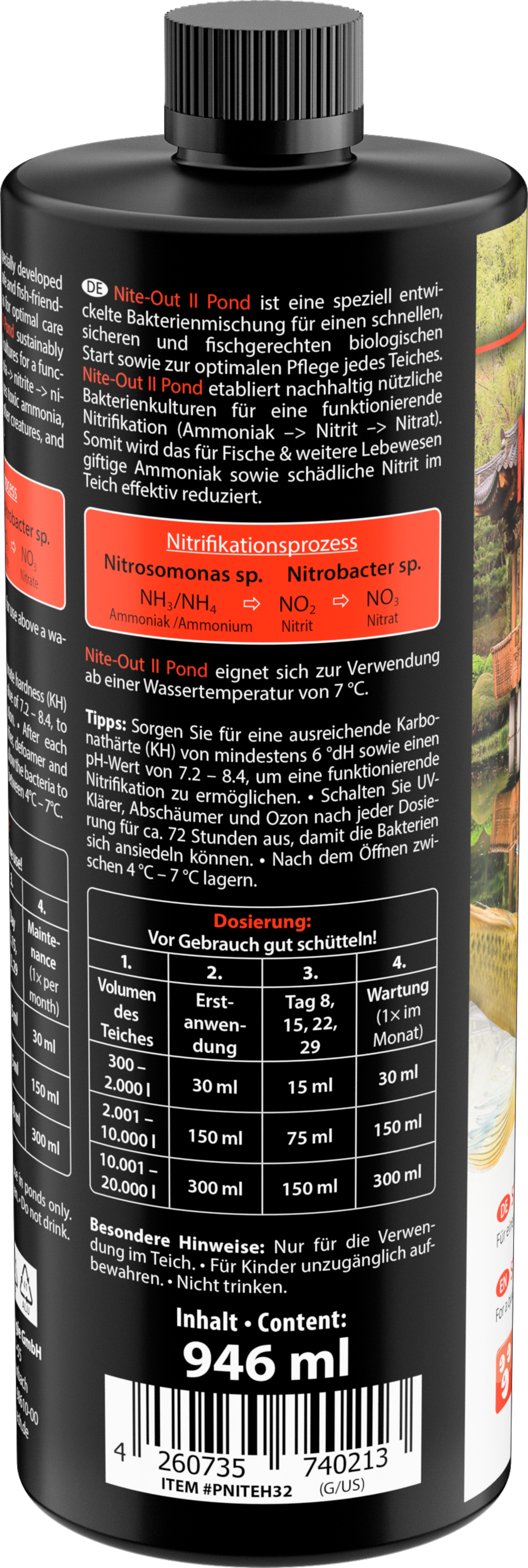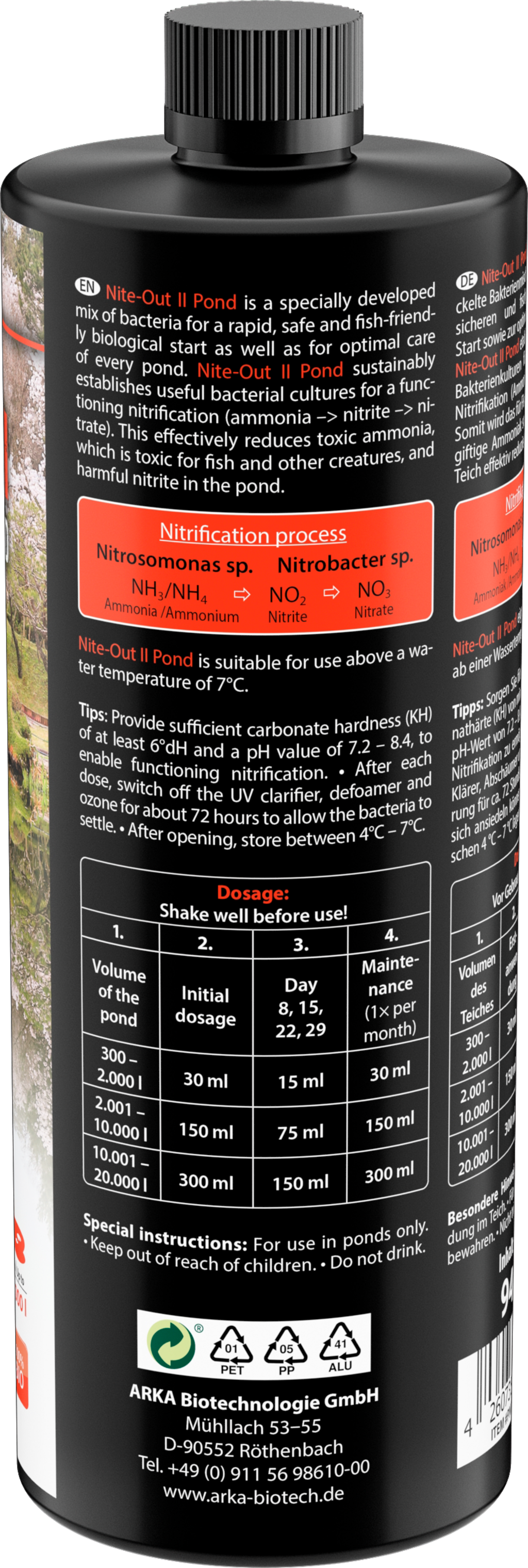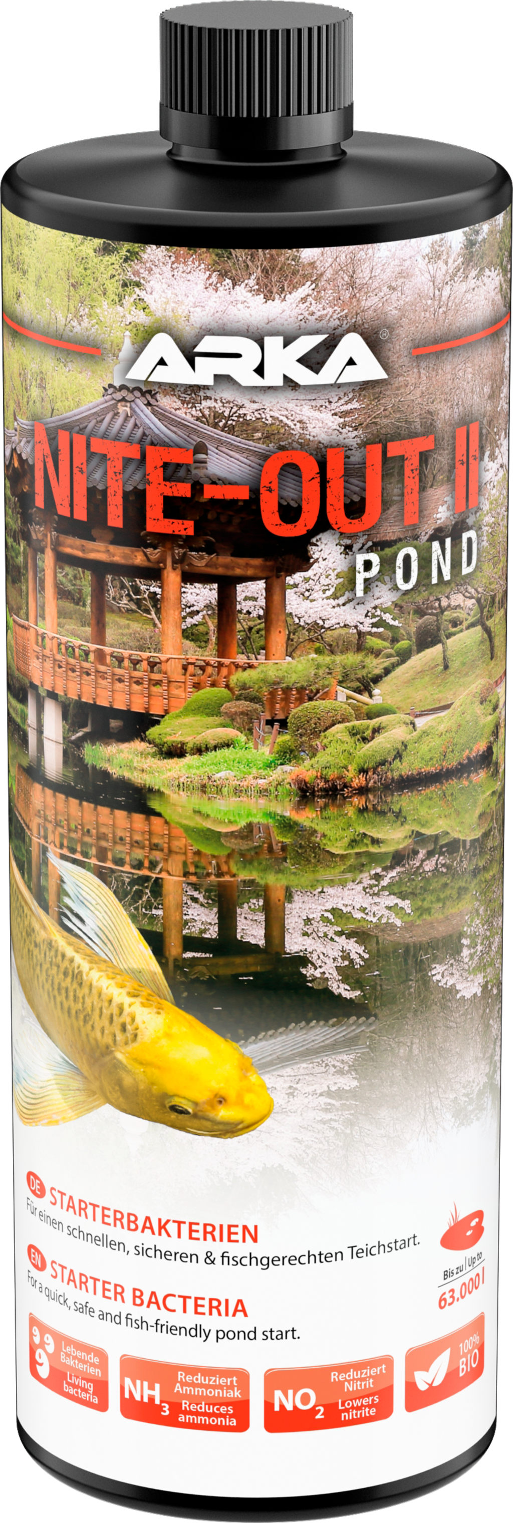 Nite-Out II Pond на ARKA осигурява биологично благоприятно за рибите начало и осигурява оптимална грижа за водата в езерото. Специално разработена смес от бактерии намалява вредните за живите организми амоняк и нитрити чрез нитрификация. Продуктът е ефективен при температура на водата от 7 °C. За да работи ефективно нитрификацията, KH трябва да е поне 6, а pH да е стабилно между 7,2 и 8,4.