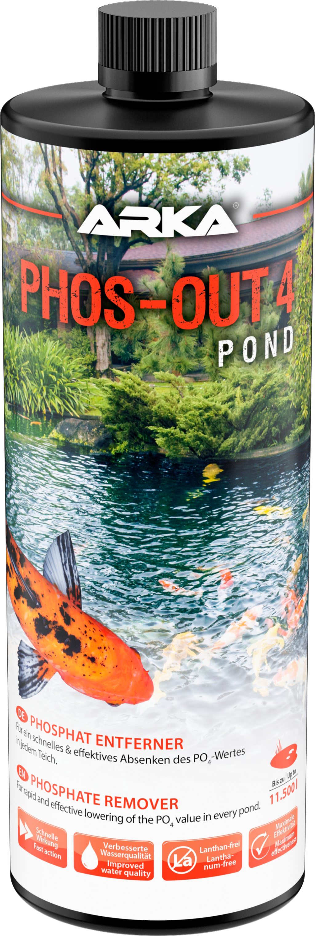 Phos-Out 4 Pond на ARKA е филтърна среда или абсорбер за бързо и ефективно намаляване на нивата на PO4 във водата в езерото. Той отстранява фосфатите бързо и надеждно, като устойчиво подобрява качеството на водата и живота на всички обитатели на езерото. Продуктът на полимерна основа нежно отстранява всички органични и неорганични фосфати, без да засяга биологията на езерото. Контролираното намаляване на стойността на PO4 е безвредно за животните.