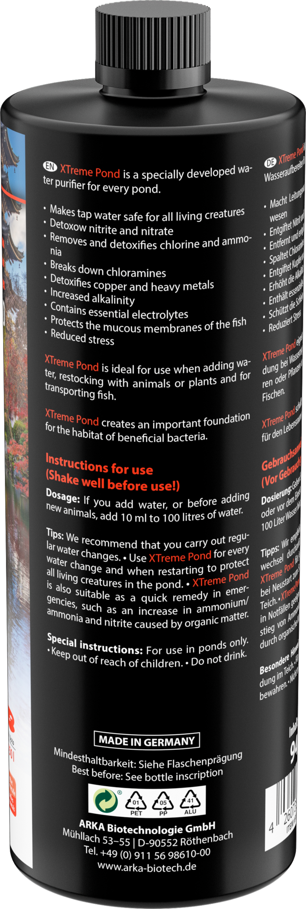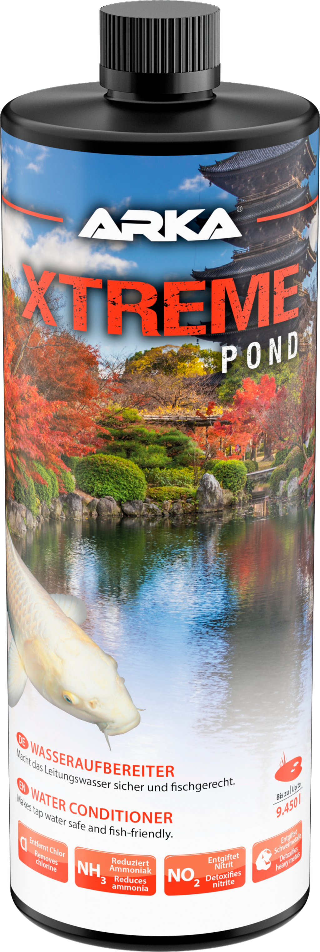 ARKA 's XTreme Pond е специално разработен за езера, за да пречиства безопасно чешмяната вода за всички живи организми, включително полезни бактерии. Подобрителът на водата съдържа есенциални електролити, детоксикира и премахва тежки метали и други вещества, вредни за рибите. Той също така разгражда хлорамините и повишава алкалността. Това предпазва лигавиците на рибите и намалява стреса. Въпреки че е предназначен за редовна употреба, продуктът е подходящ и за извънредни ситуации, като например внезапни скокове в нивата на амоний/амоняк.
