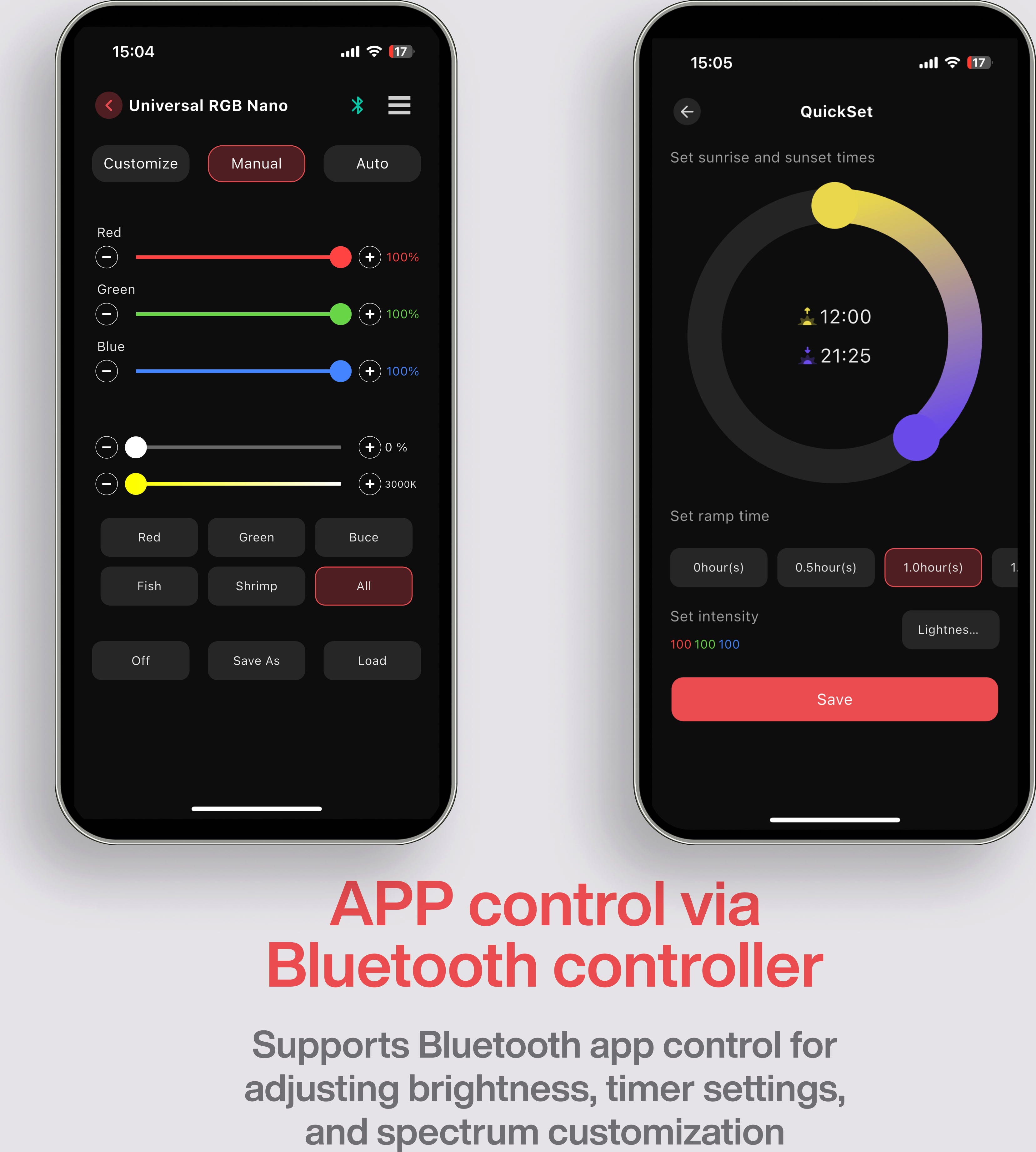 Цялото управление на осветлението може лесно да се контролира чрез приложението Chihiros. Вградената функция Bluetooth прави излишен всеки външен контролер. Чрез приложението можете да персонализирате цветовата температура, да регулирате непрекъснато интензитета на светлината или да програмирате цялостни светлинни последователности. Възможно е също така да се симулира изгрев и залез или да се зададат точни часове, в резултат на което да се получи естествена светлинна среда, адаптирана към нуждите на организмите-домакини. Доставената стабилна стойка позволява лесен и безопасен монтаж на ръба на аквариума.