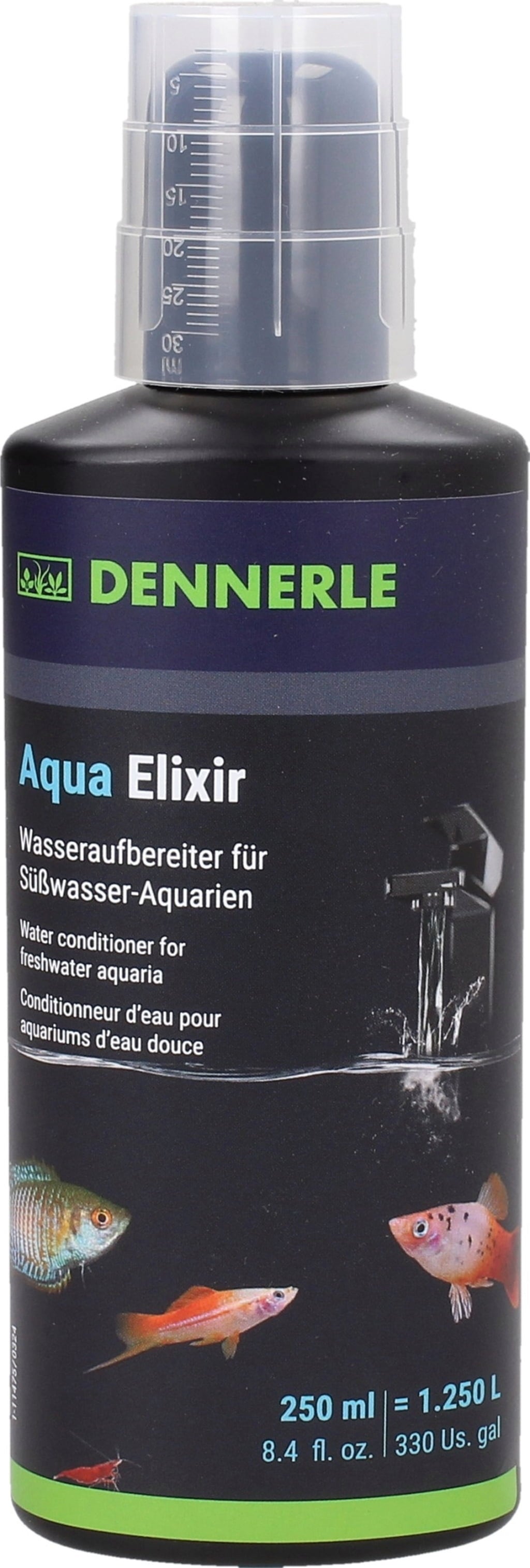 Aqua Elixir е продукт, предназначен за лечение на сладководни аквариуми. Чешмяната вода съдържа тежки метали като мед, олово, цинк и хлор. Специалните препарати за подобряване на водата, включително Aqua Elixir от Dennerle, свързват и неутрализират тези вещества. Ценният екстракт от листата на Моринга предпазва чувствителните хриле, перки и лигавици на животните, а също така намалява нивата на стрес. Aqua Elixir добавя и активни съставки, които липсват във водата.