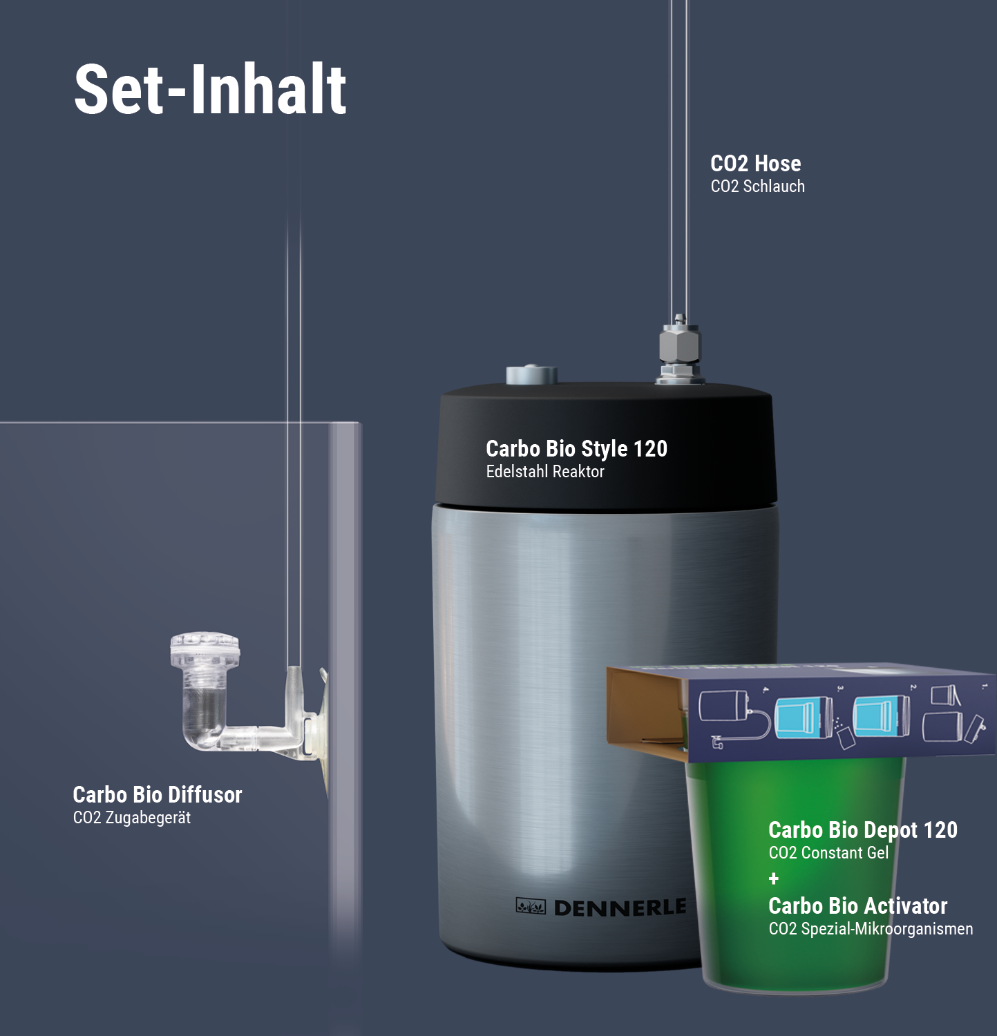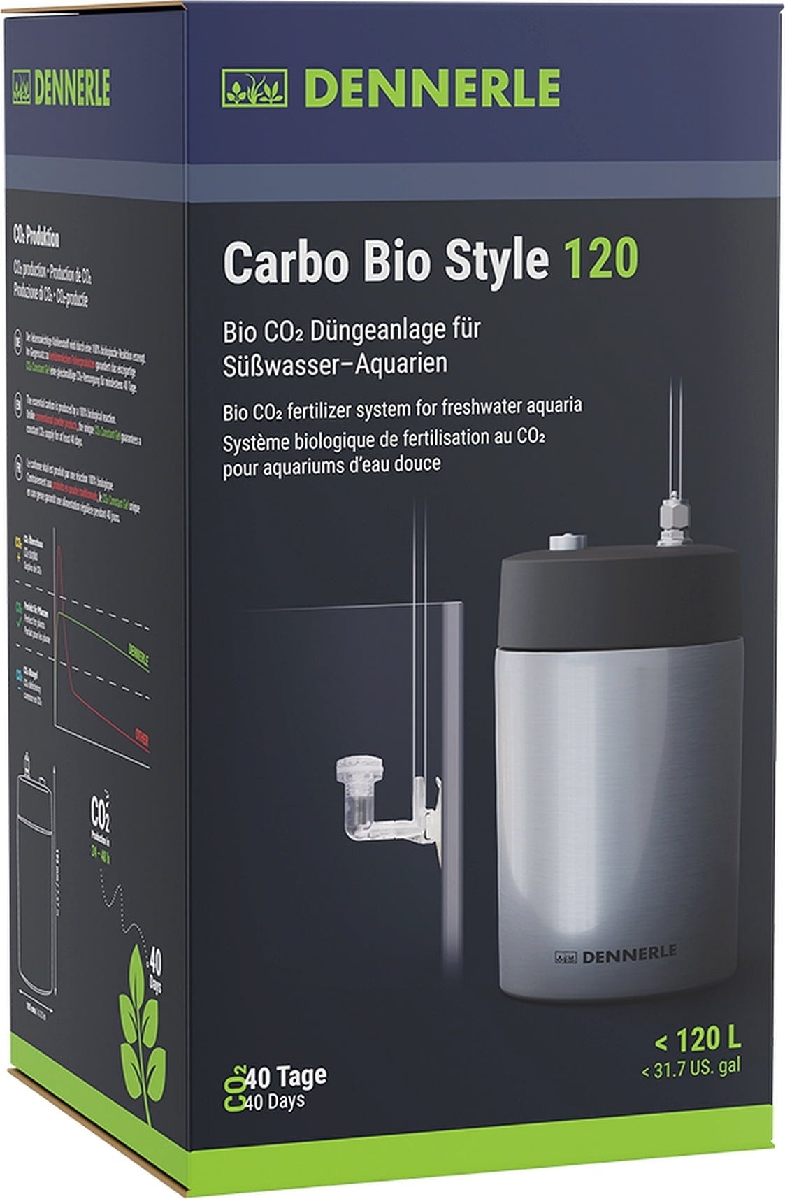 Carbo Bio Style 120 на Dennerle е система за торене с CO2 за сладководни аквариуми до 120 литра. Комплектът се отличава с лесна настройка, бързо производство на CO2 в рамките на 24–48 часа и специално разработен CO2 биодифузер за ниско работно налягане.
