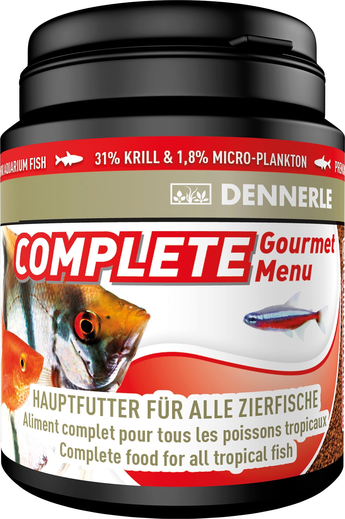 CompleteGourmet Menu е пълноценна гранулирана храна, подходяща за вашите рибки в общ аквариум. Гранулите, които се състоят от 30 различни съставки, се приемат добре от риби с различни размери. Тази храна се състои от 60% естествени ракообразни и мекотели и 4% естествени водорасли. Формулата съдържа и листа от Moringa olifera, които са богати на микроелементи и витамини. С 31% крил и 1,8% микропланктон можете да храните правилно дори най-малките риби Фуражът съдържа пробиотични и пребиотични съставки, които имат благоприятен ефект върху жизнеността и растежа на рибите.