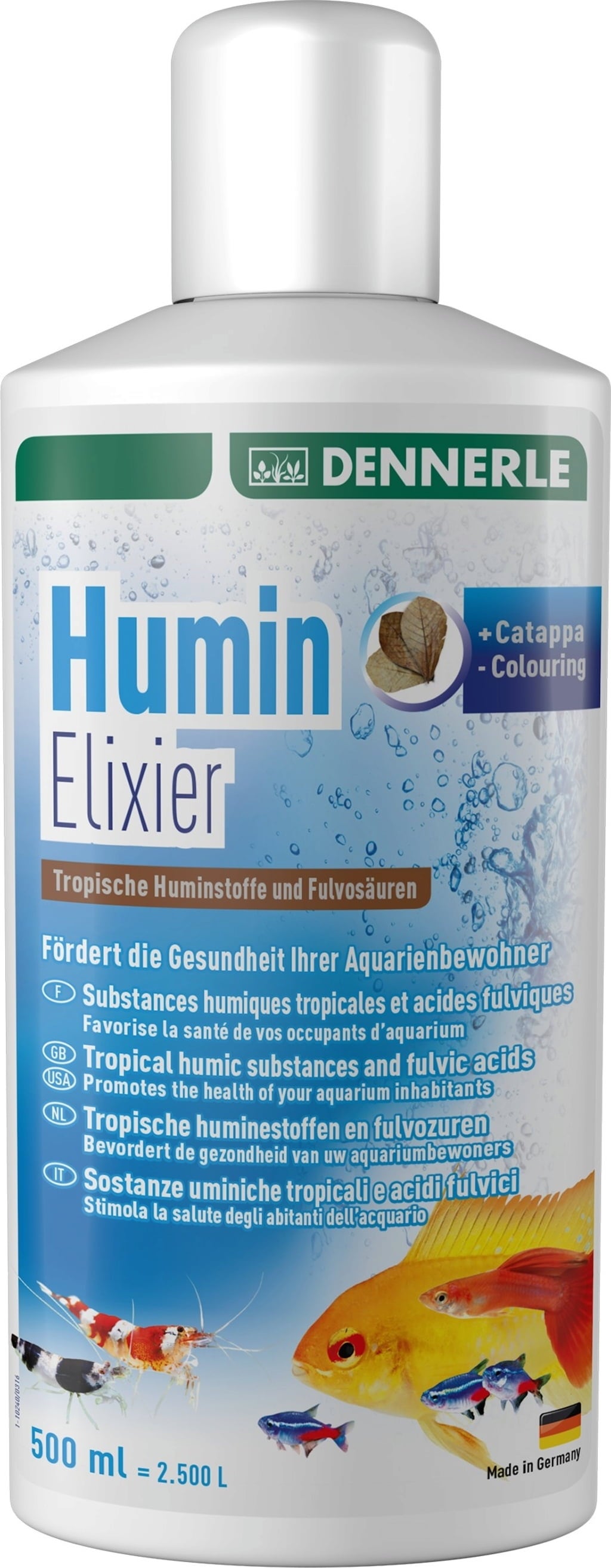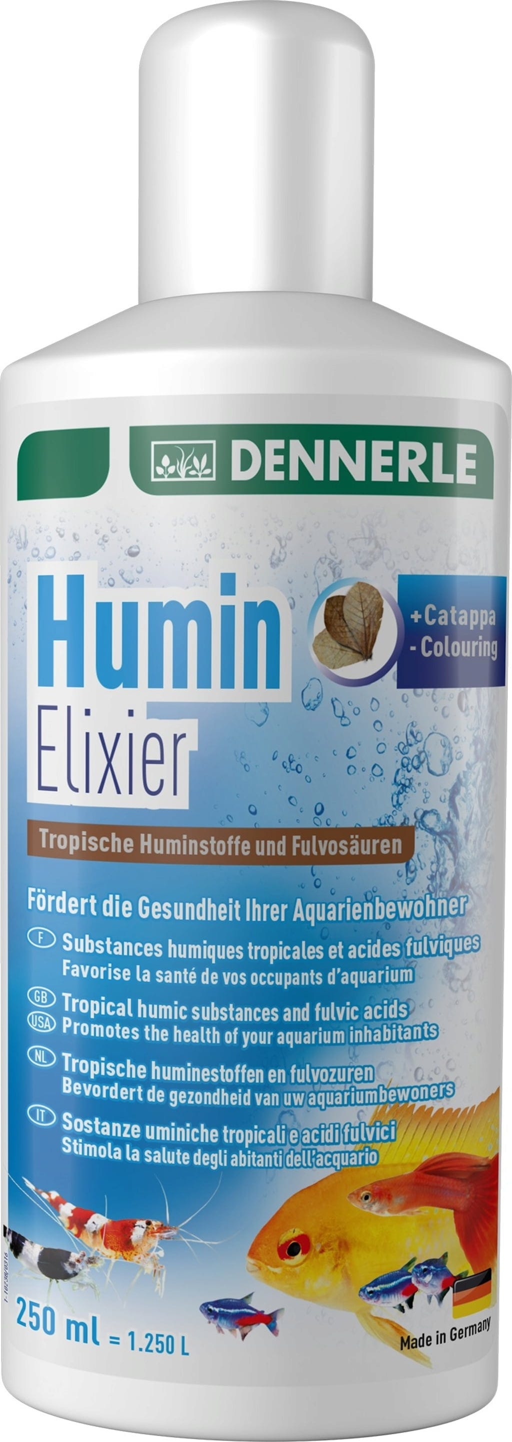 Сместа от ценни хуминови и фуволови киселини в Humin Elixier подготвя водата в аквариума по подходящ за биотопа начин. Humin Elixier е идеален за успешно отглеждане и размножаване на риби и скариди, които са свикнали с хуминови вещества от естествената си среда. Кондиционерът за вода насърчава балансирания растеж, здравето, жизнеността и цветността. Освен това водата не придобива обезпокояващ жълт цвят.