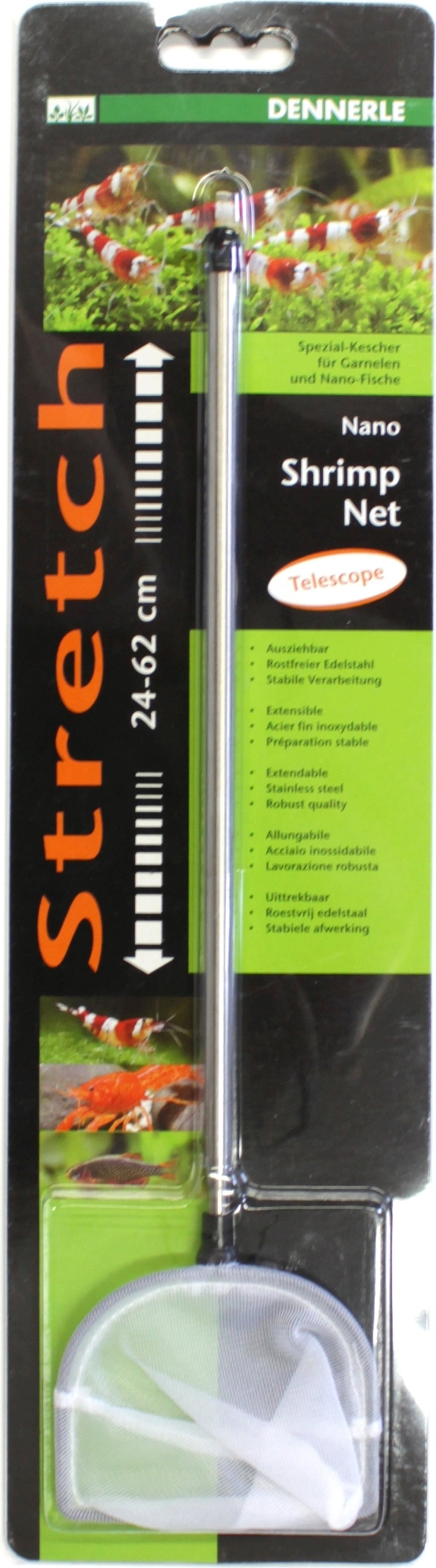 Тази мрежа за скариди от неръждаема стомана разполага с удобна дръжка, която се разтяга до 62 см, и примка за окачване. Кошницата е с размери 7,5 x 6 см. Този инструмент ви позволява безопасно да ловите скариди и малки рибки и лесно да ги изваждате от аквариума.