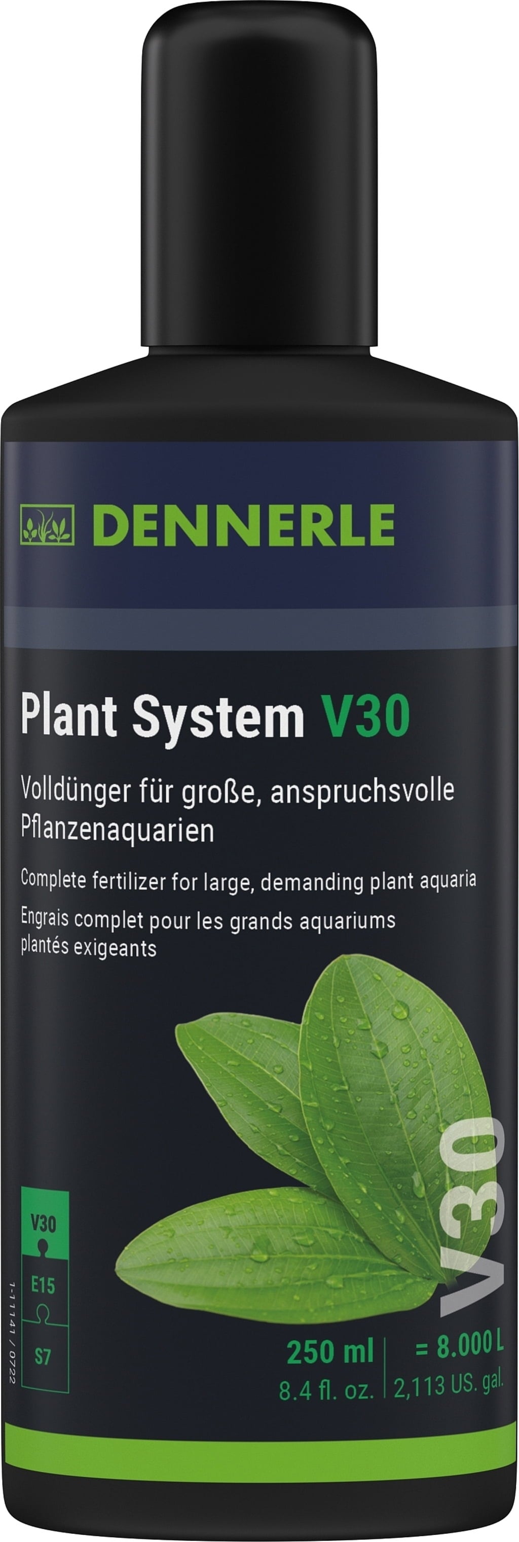 Както всички торове на Dennerle, V30 е много добре стабилизиран, което означава, че има трайно стабилен ефект (депо ефект). Не съдържа фосфати и нитрати и не стимулира развитието на водорасли.