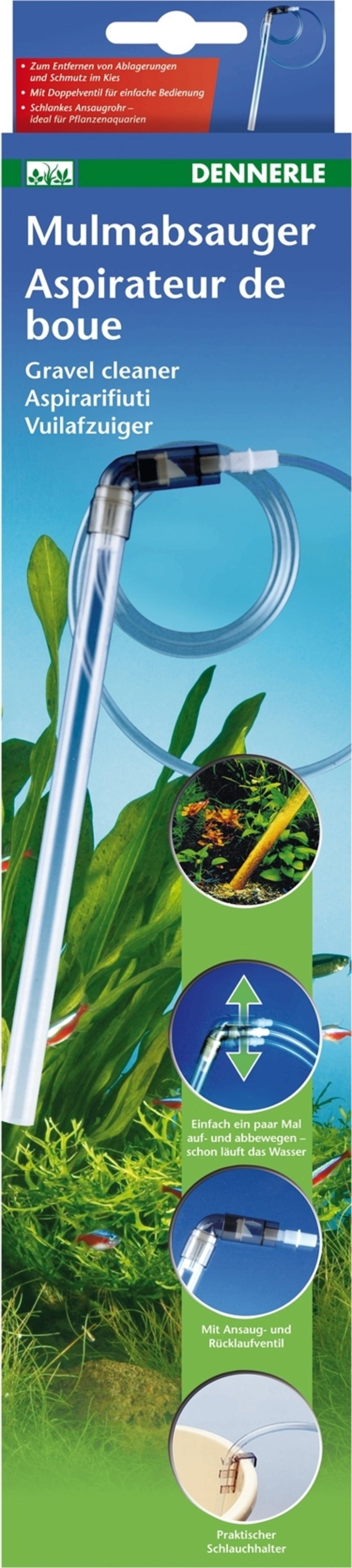 С прахосмукачката Dennerle Gravel Cleaner лесно почиствате дъното на вашия аквариум. Благодарение на вградения двоен клапан за процеса на засмукване и връщане, стартирайте прахосмукачката, без да се налага да засмуквате с уста. Движете я нагоре и надолу няколко пъти и водата започва да тече! С тънката смукателна тръба можете да работите и отпред, отзад и между растенията и да почистите цялото дъно на аквариума сравнително бързо.