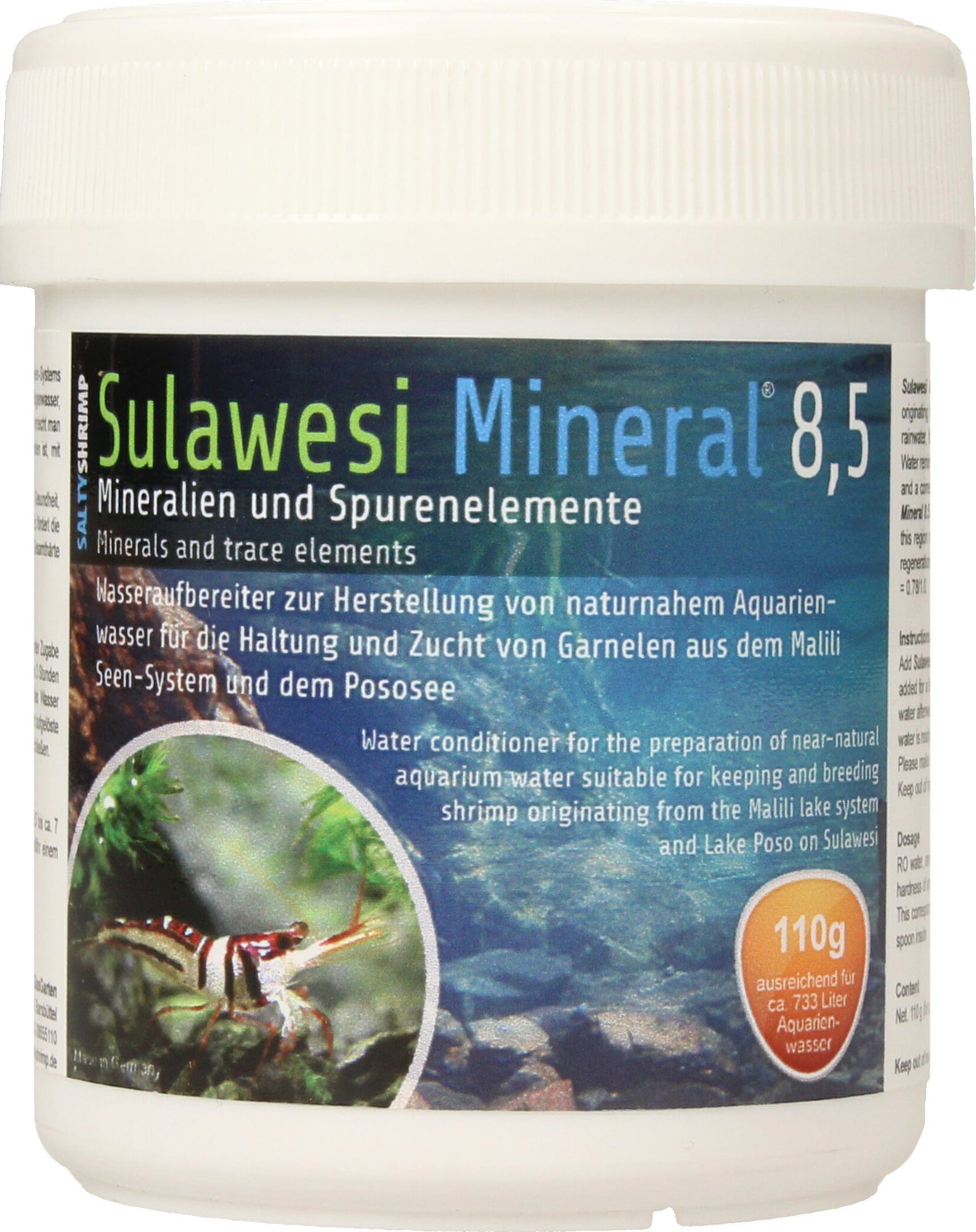 Минералната сол SaltyShrimp Sulawesi Mineral 8,5 е разработена специално за отглеждането на деликатните скариди от езерото Таути. Водата от езерото е анализирана в лаборатория и въз основа на тези резултати е съставена солта SaltyShrimp Sulawesi Mineral 8,5. С помощта на тази минерална сол е възможно да се имитира водата от езерото Таути почти перфектно, до най-малкия детайл, включително високата стойност на рН от 8,5.