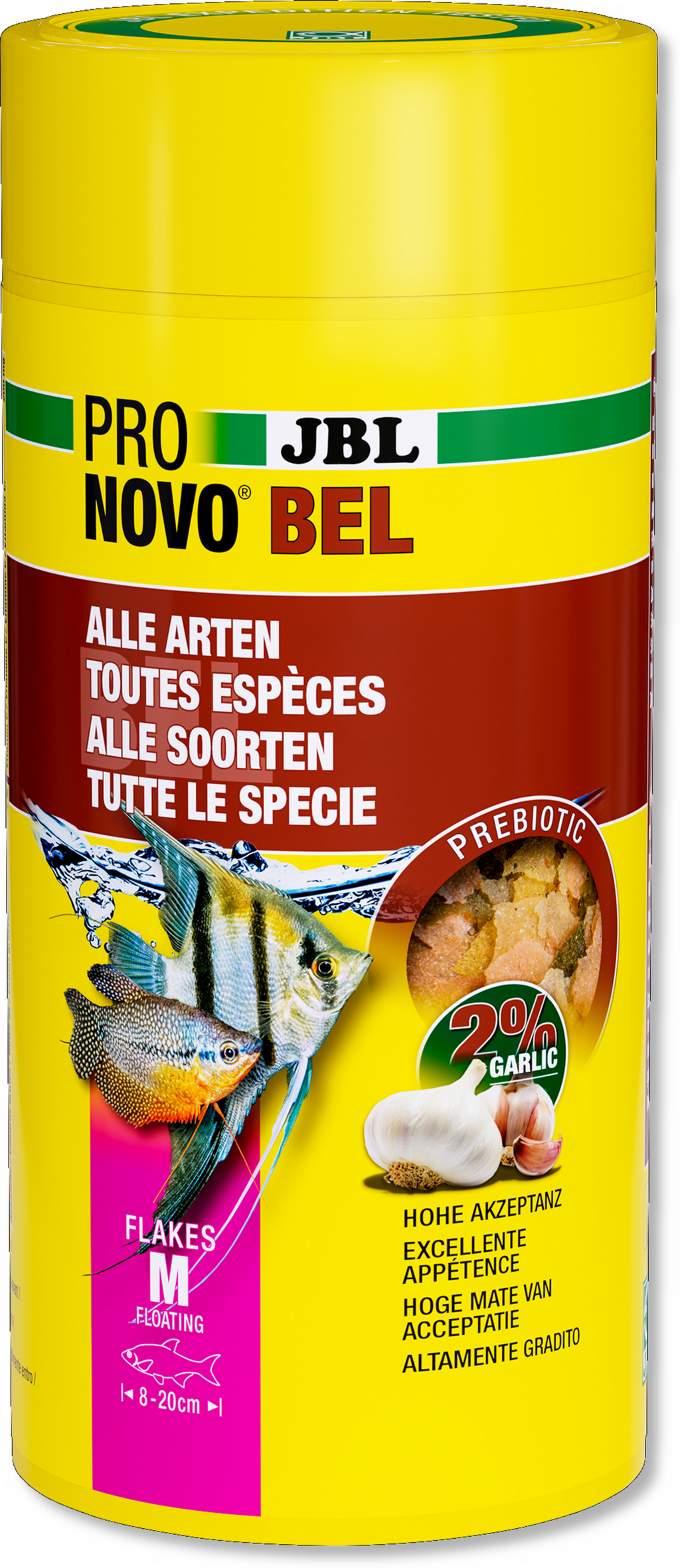 В аквариумите със смесени риби различните хранителни нужди и предпочитания могат да се окажат сериозно предизвикателство. JBL Pronovo Bel Flakes M е висококачествена и разнообразна основна храна за декоративни рибки с размери 8-20 см. Плаващите люспи съдържат естествени суровини и не изискват никакви оцветители или изкуствени добавки. Отличната комбинация от съставки от животински (сьомга, калмари, скариди) и растителен (чесън, крил, спирулина) произход прави храната много вкусна дори за капризните риби! Специалните фибри също подпомагат храносмилането на вашата риба!