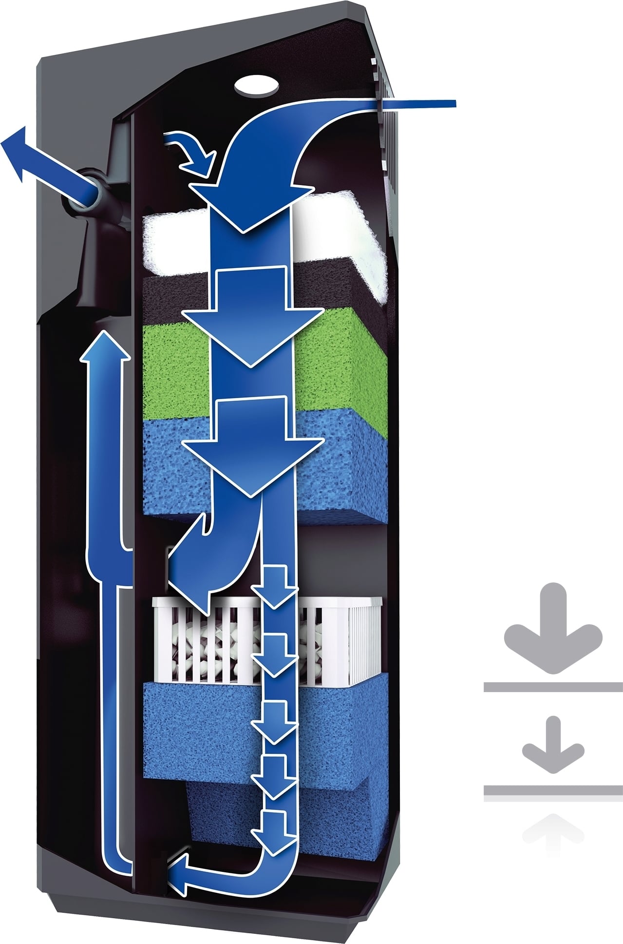 Уникалният принцип на двойния поток в системата Juwel Bioflow осигурява различни скорости на водния поток в отделните зони на филтъра и значително допринася за високата ефективност на филтриране. По-бързият поток в горната част подпомага механичното и химическо филтриране, докато по-бавният поток в долната зона създава оптимални условия за развитие на анаеробни бактерии, от съществено значение за биологичното пречистване.