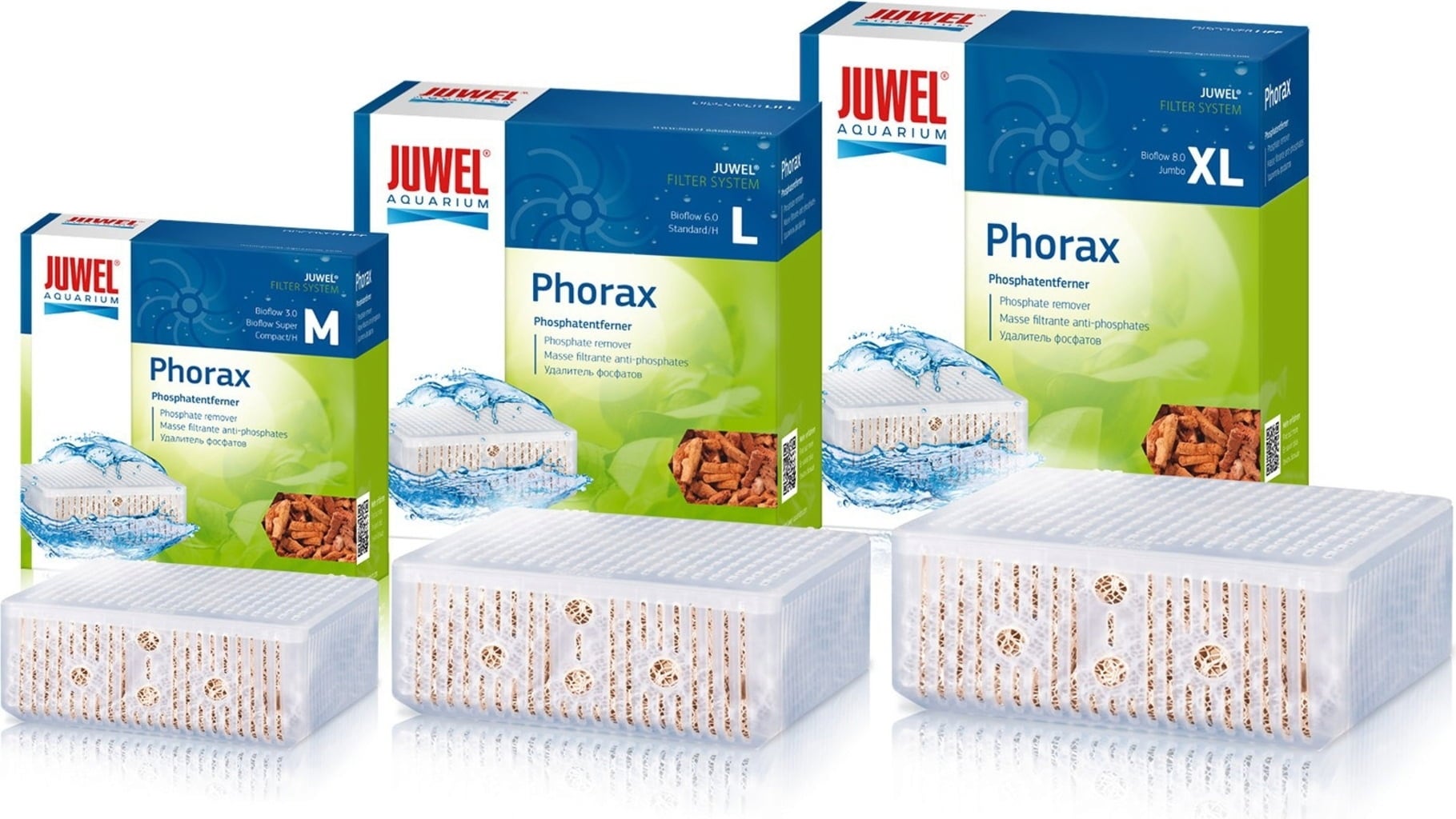 Всяка Bioflow система е оборудвана с пет висококачествени филтърни материали. На шесто място се намира опционалната кошница Phorax – високоефективен филтърен материал за разграждане на фосфатите във вашия аквариум. Той ефективно намалява растежа на водораслите и може значително да допринесе за подобрен растеж на растенията. Фосфатите редовно попадат в аквариума чрез храната за риби и по естествен път почти не се разграждат. Растенията обаче се нуждаят само от минимални количества за нормалния си растеж (сладководни аквариуми: 0,05 mg/l, морска вода: 0,01 mg/l). Прекомерното количество фосфати може да доведе до поява на водорасли. Phorax е алуминиев минерал, който свързва разтворения фосфат чрез образуване на неразтворим във вода алуминиев фосфат и по този начин го извлича от водата. Благодарение на това JUWEL Phorax е изключително ефективен и свързва до 12 mg фосфат на грам Phorax.