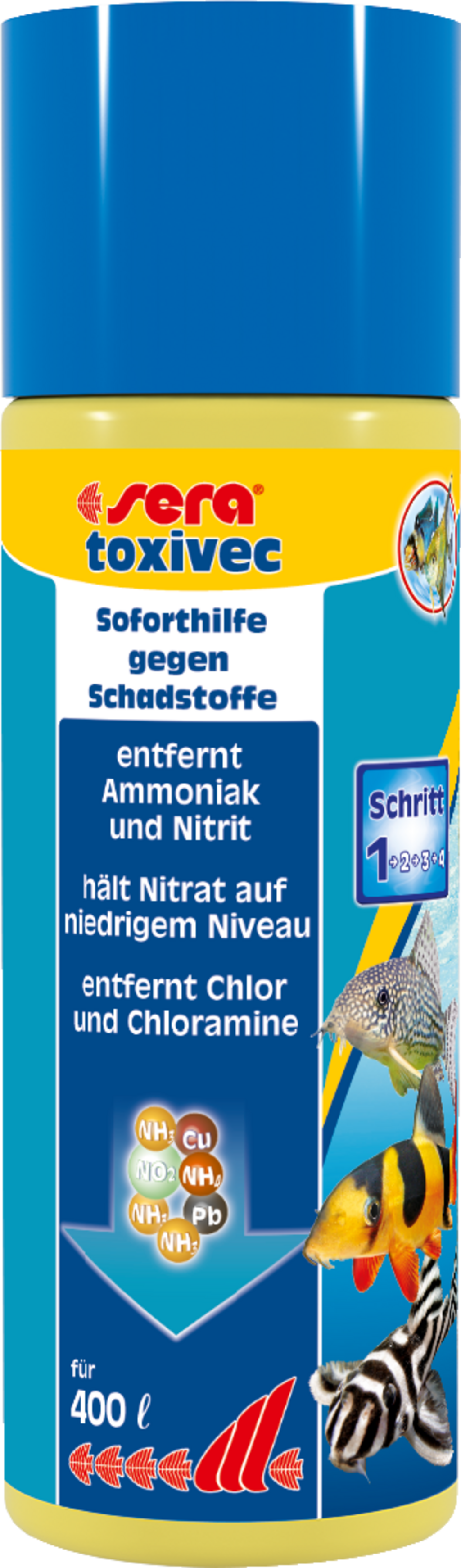 Поради дестабилизиращи фактори като прехранването, високата гъстота на животните, новото оборудване, основните мерки за почистване или дори употребата на лекарства могат внезапно да причинят масивни пикови натоварвания с токсични за рибите замърсители като амоняк и нитрити в аквариума. Sera toxivec незабавно премахва тези токсини в такива извънредни ситуации, както и други опасни вещества като хлор и тежки метали. Естественият баланс бързо се възстановява чрез премахване на замърсяването и по този начин се предотвратява ново замърсяване чрез широкомащабни частични промени на водата.