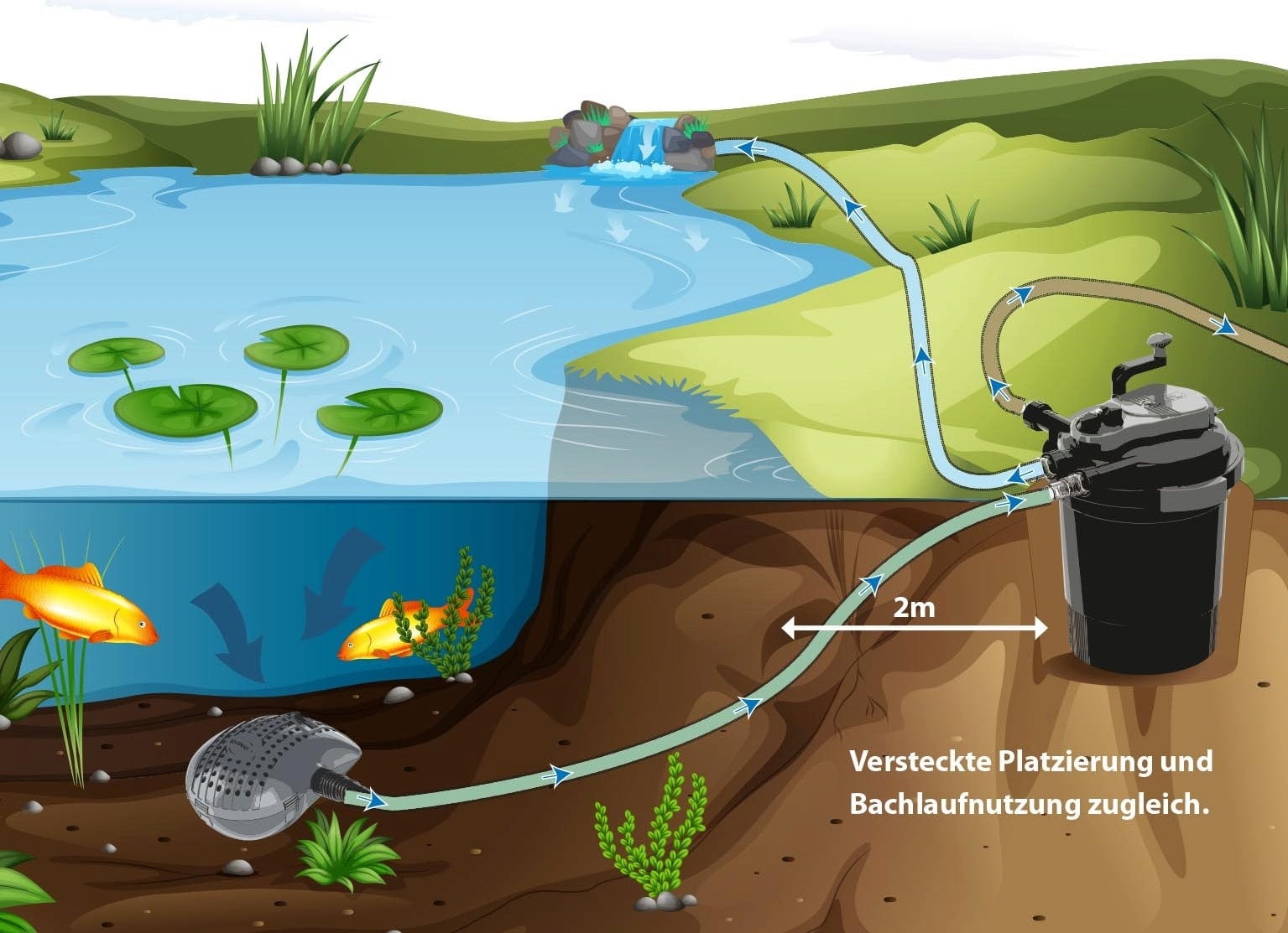 Филтърната система за езерце HEISSNER Aqua Craft Eco с регулируема филтърна помпа и вграден UVC пречиствател предлага ефикасно цялостно решение за вашето езерце. Благодарение на системата за обратно промиване, филтърът може да се почисти за секунди, без да е необходимо да отваряте корпуса. Разхлабената мръсотия се изхвърля просто през отделен изход. Пречистената вода може лесно да се изпомпва към по-високи потоци или фонтани или да се използва за декоративни водни елементи.