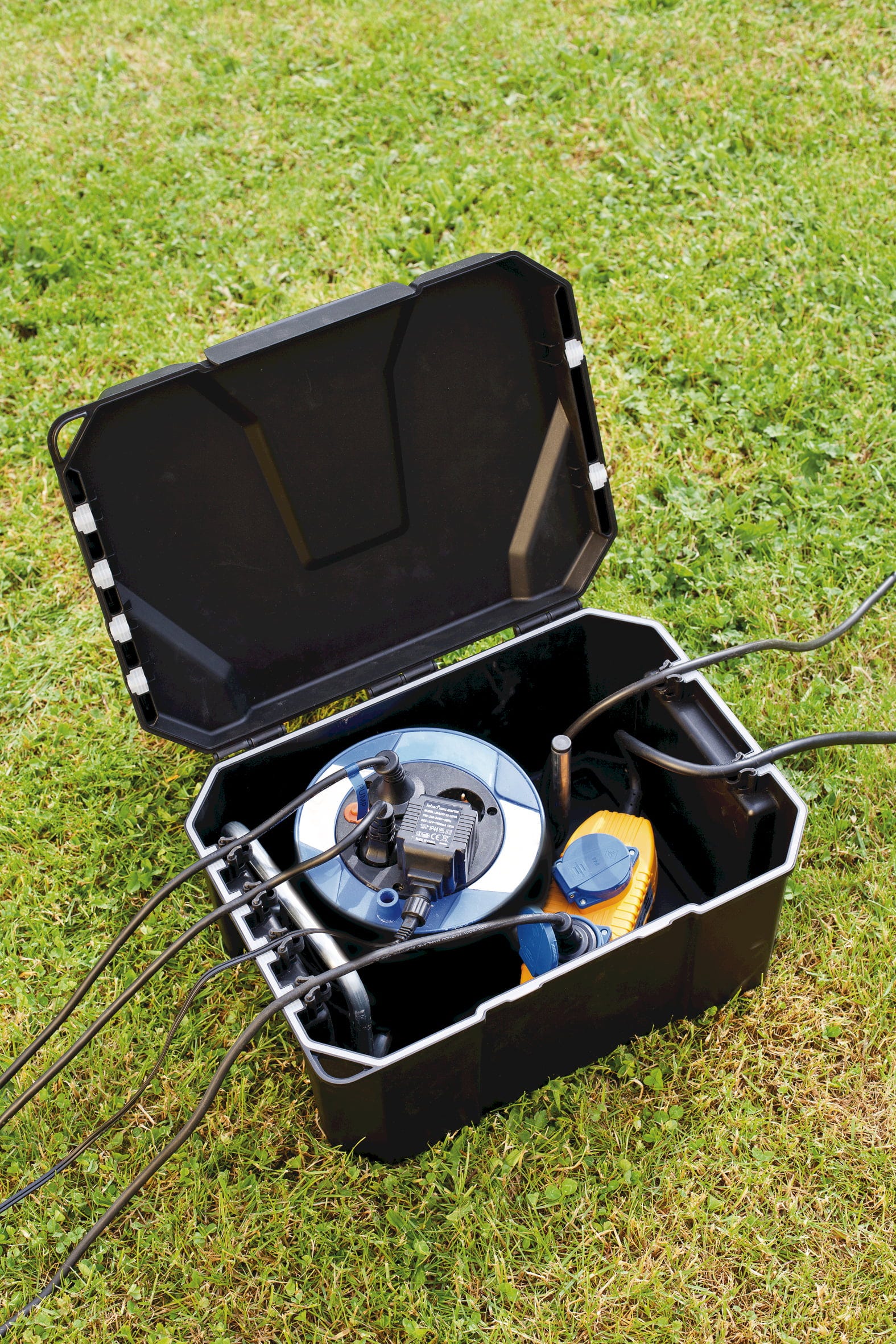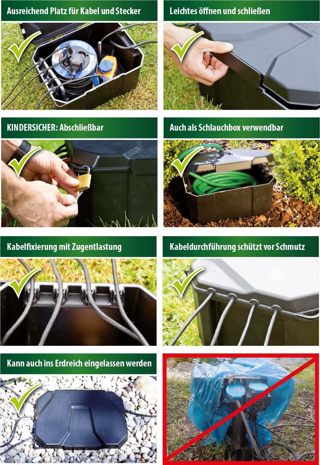 Градинската кабелна кутия HEISSNER служи като централна, устойчива на атмосферни условия станция за подредено и защитено разполагане на разклонители, таймери или радио приемници на открито. Кутията със защита IP64 разполага със специални уплътнения при входовете за кабели и надеждно предпазва електрониката от влага и замърсяване. Здравият корпус може да се заключва за детска безопасност и да бъде почти изцяло вкопан в земята за дискретен външен вид.