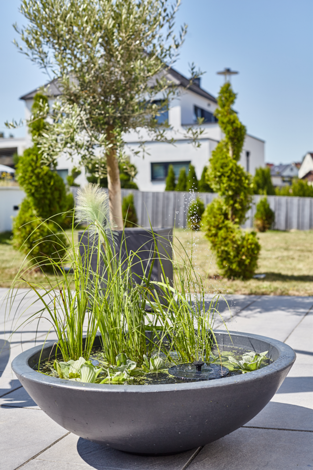 Тази водна градина HEISSNER превръща всяко външно пространство в успокояващ оазис и забележимо подобрява микроклимата. Благодарение на помпата, захранвана от слънчева енергия, можете да се наслаждавате на нежния звук на плискане по екологичен начин, без никакви разходи за електричество. Инсталирането ѝ не може да бъде по-лесно: напълнете я с вода, добавете растения и се насладете на природата. Дори в най-малките пространства можете да създадете естетически акцент и ценен източник на вода за полезни същества.