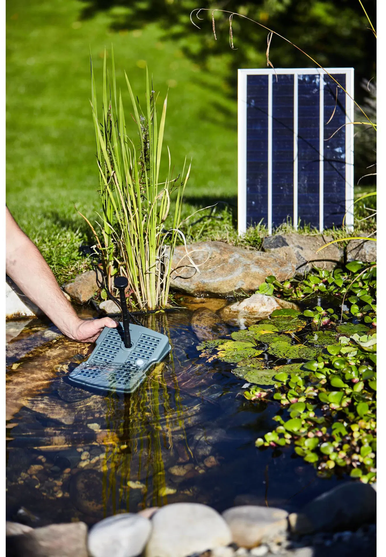 Този иновативен хибриден комплект от HEISSNER съчетава ефективно пречистване на водата с декоративни водни елементи, използвайки предимно слънчева енергия. Компактният подводен филтър е предназначен за езера без риби и интегрира помпа, филтърна среда и UVC пречиствател в един корпус.