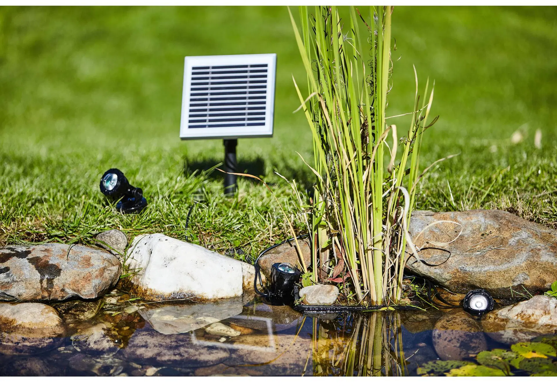 Този соларен комплект HEISSNER за осветление на езеро и градина позволява безжично осветяване на водни и градински зони чрез използване на слънчева енергия. Мощният соларен панел зарежда вградената батерия през деня, а интегрираният сензор автоматично активира водоустойчивите лампи при здрач, осигурявайки до осем часа атмосферно осветление. Благодарение на включените колчета за земя, прожекторите могат да бъдат позиционирани гъвкаво. Чрез избор на цвят могат директно да се зададат седем различни нюанса за индивидуални светлинни акценти около езера или растения.