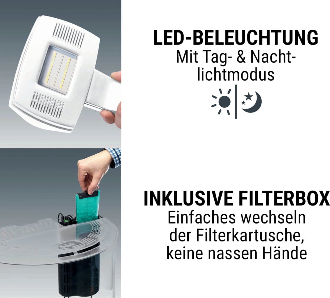 И ето как работи: Оборудването, т.е. филтърът и осветлението, са съобразени с размера на аквариума и не се забелязват. Прозрачният капак от акрилна смола също изглежда много деликатен и винаги позволява добра видимост.