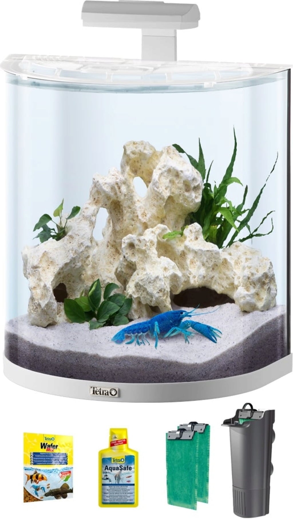 Аквариумният комплект Tetra AquaArt Explorer Line предлага модерен дизайн, съчетан с иновативна технология, както и лесни и удобни решения за поддръжка за създаване на завладяващи подводни светове. Свързаната с аквариума 5-ватова LED светлина осигурява естествено осветление на аквариума. Високоефективният филтър Tetra EasyCrystal допълва целия комплект и осигурява идеални условия за живот на раците и другите безгръбначни и растения. Аквариумният комплект е проектиран в атрактивен дизайн тип "полумесец" и убеждава с извития на 180° преден екран. С дебелина на стъклото от 5 мм аквариумът е с особено високо качество. Комплектът включва и мощно и дълготрайно LED осветление, което е много енергоспестяващо с 5 W и може да се превключва между дневна и нощна светлина. Висококачествената прозрачна покривна плоча от акрилна пластмаса позволява оптимално осветяване на аквариума и има вградена клапа за хранене. Благодарение на филтърната технология EasyCrystal е осигурена необходимата циркулация на водата. В комплекта вече е включен продукт за хранене.