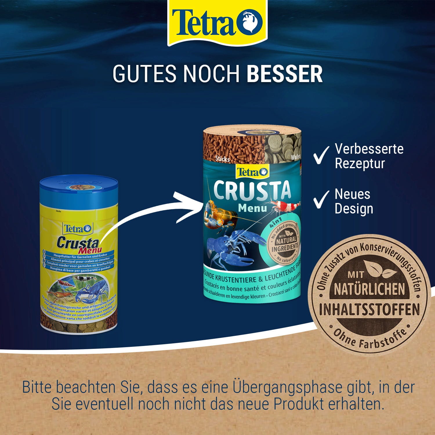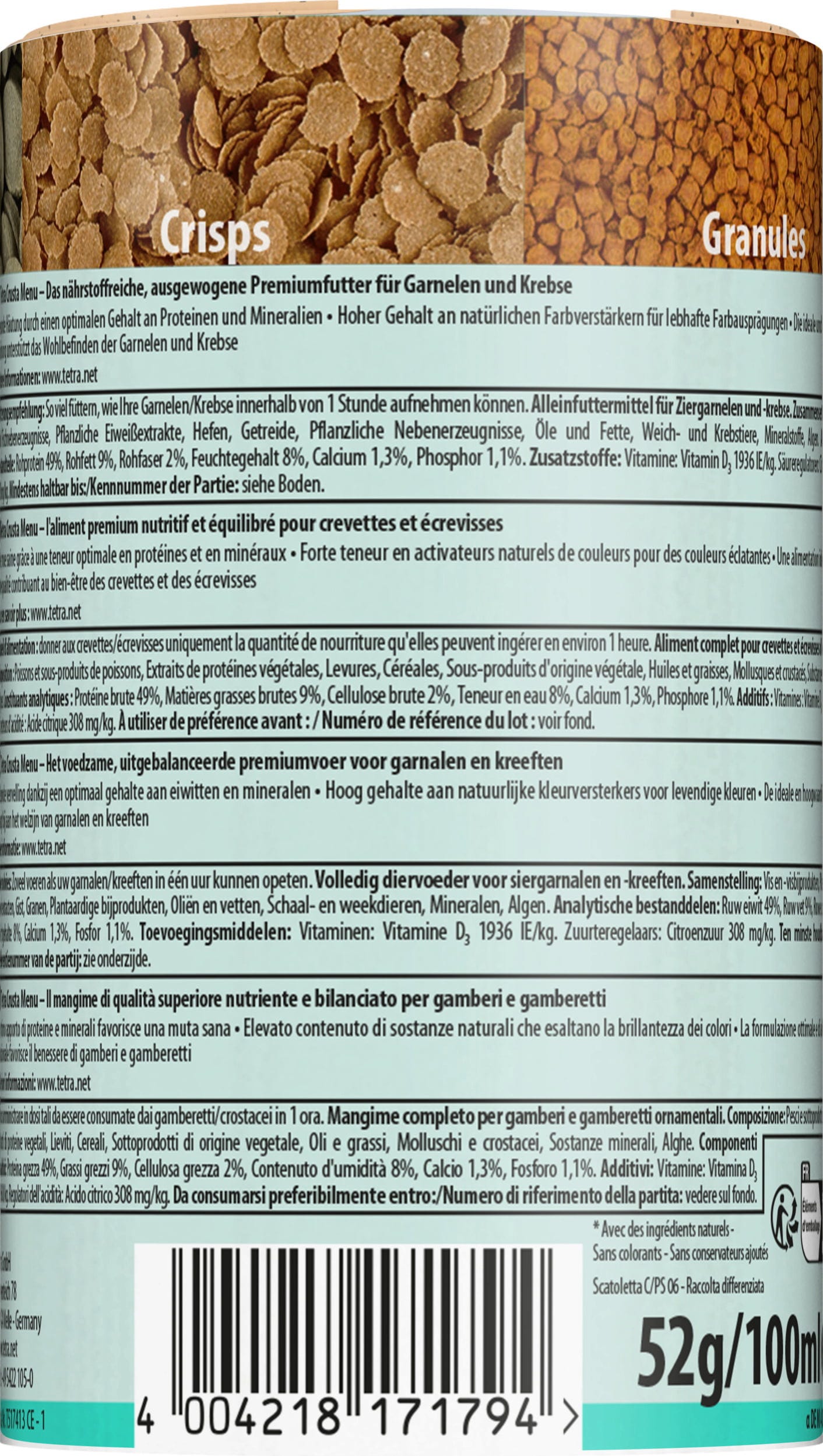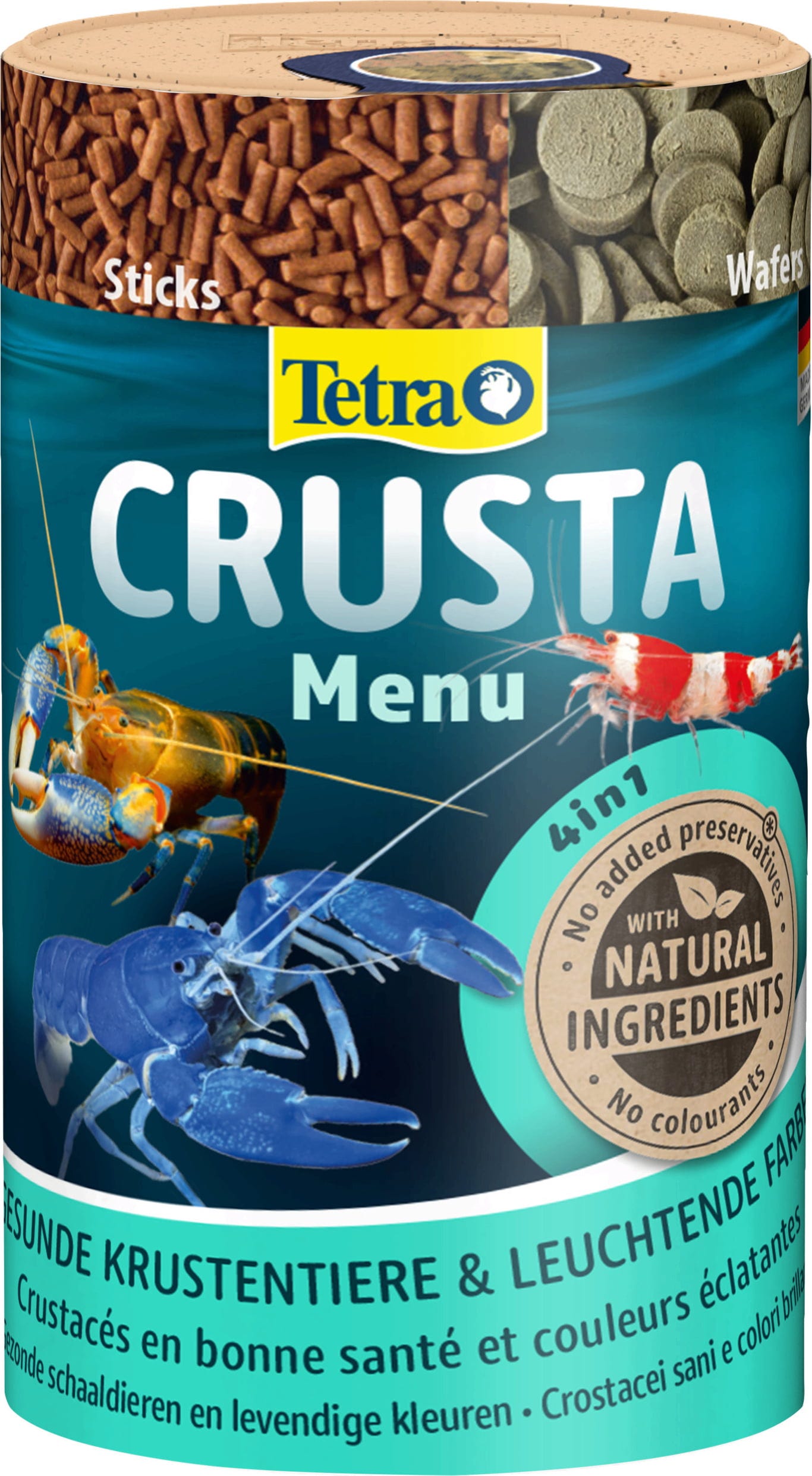Crusta Menu е основна храна за скаридите и раците. Четирите координирани вида храна осигуряват балансирано и разнообразно хранене. Благодарение на стабилността на формата си те позволяват естествено поведение при хранене и не замърсяват водата. Оптималното съдържание на белтъчини и минерали осигурява здравословно линеене. Устойчивостта се подсилва от растителните компоненти и основните витамини.
