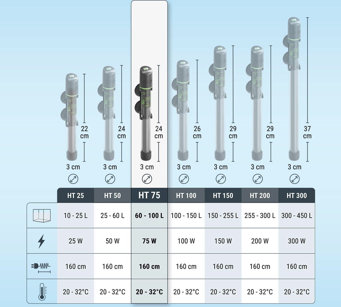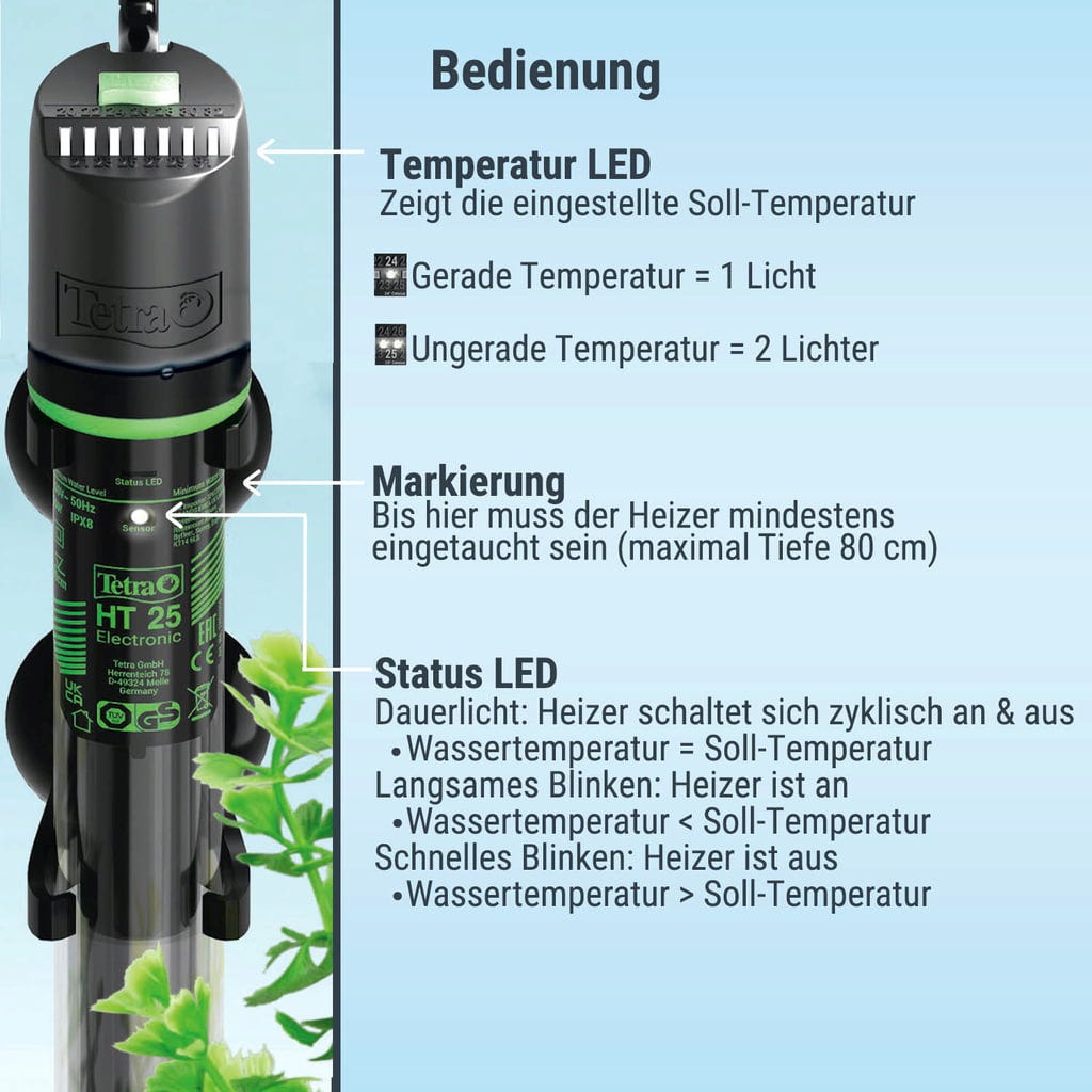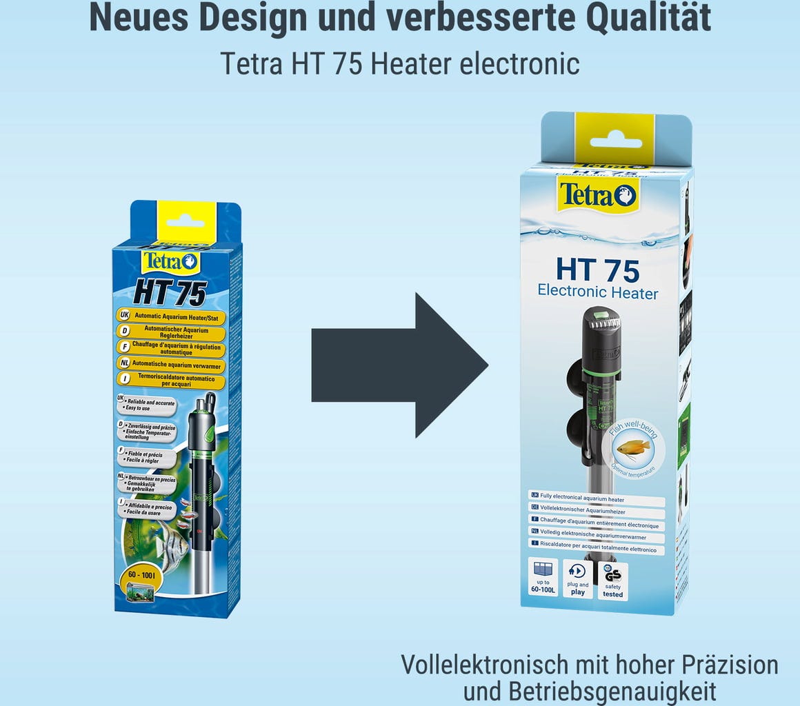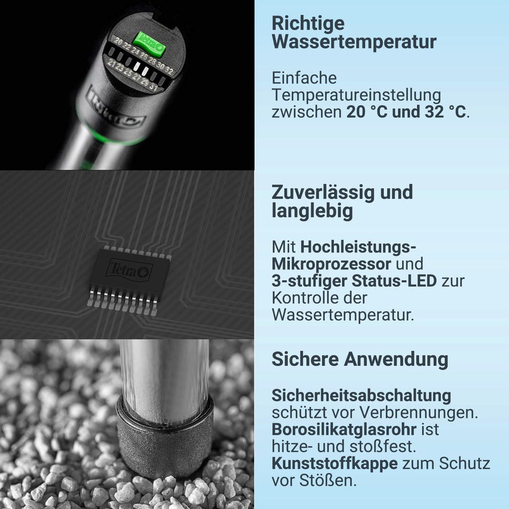 Регулируемият нагревател Tetra HT покрива различни нива на ефективност. Температурата може лесно да се настрои отгоре на нагревателя и варира от 20°C до 32°C. Температурата може да се контролира с помощта на 3-степенни светодиоди.