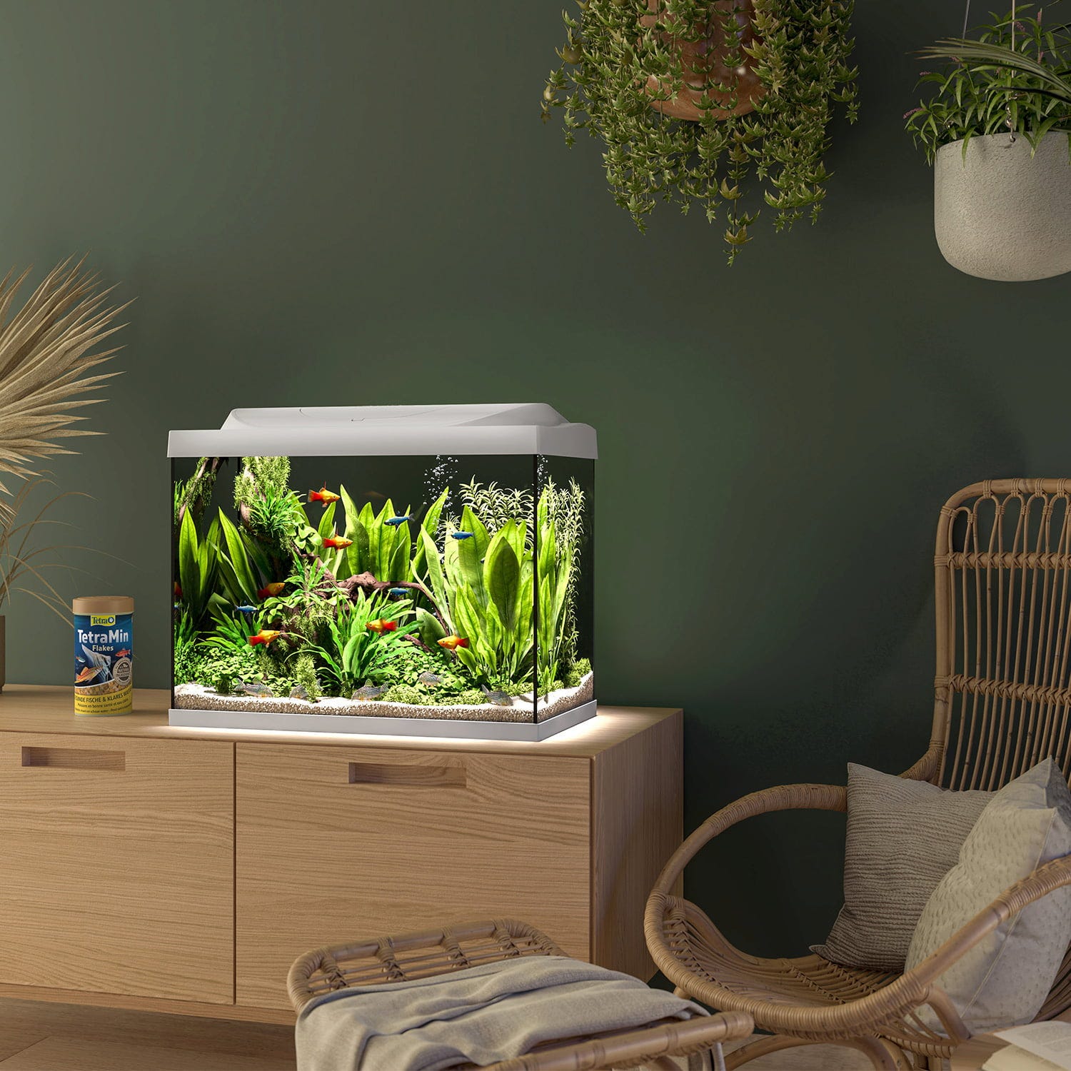 За да се уверите, че обитателите на аквариума се чувстват като у дома си, надежден 75-ватов нагревател регулира температурата до постоянни 25 °C - не е нужно да се притеснявате за нищо друго! Tetra включва дори основната храна TetraMin и кондиционера за вода Tetra AquaSafe - така че можете да започнете работа веднага.