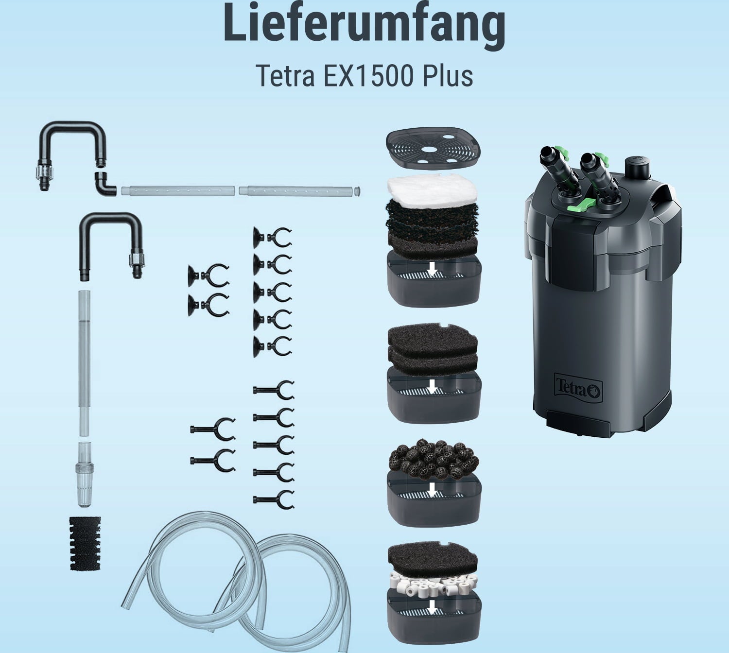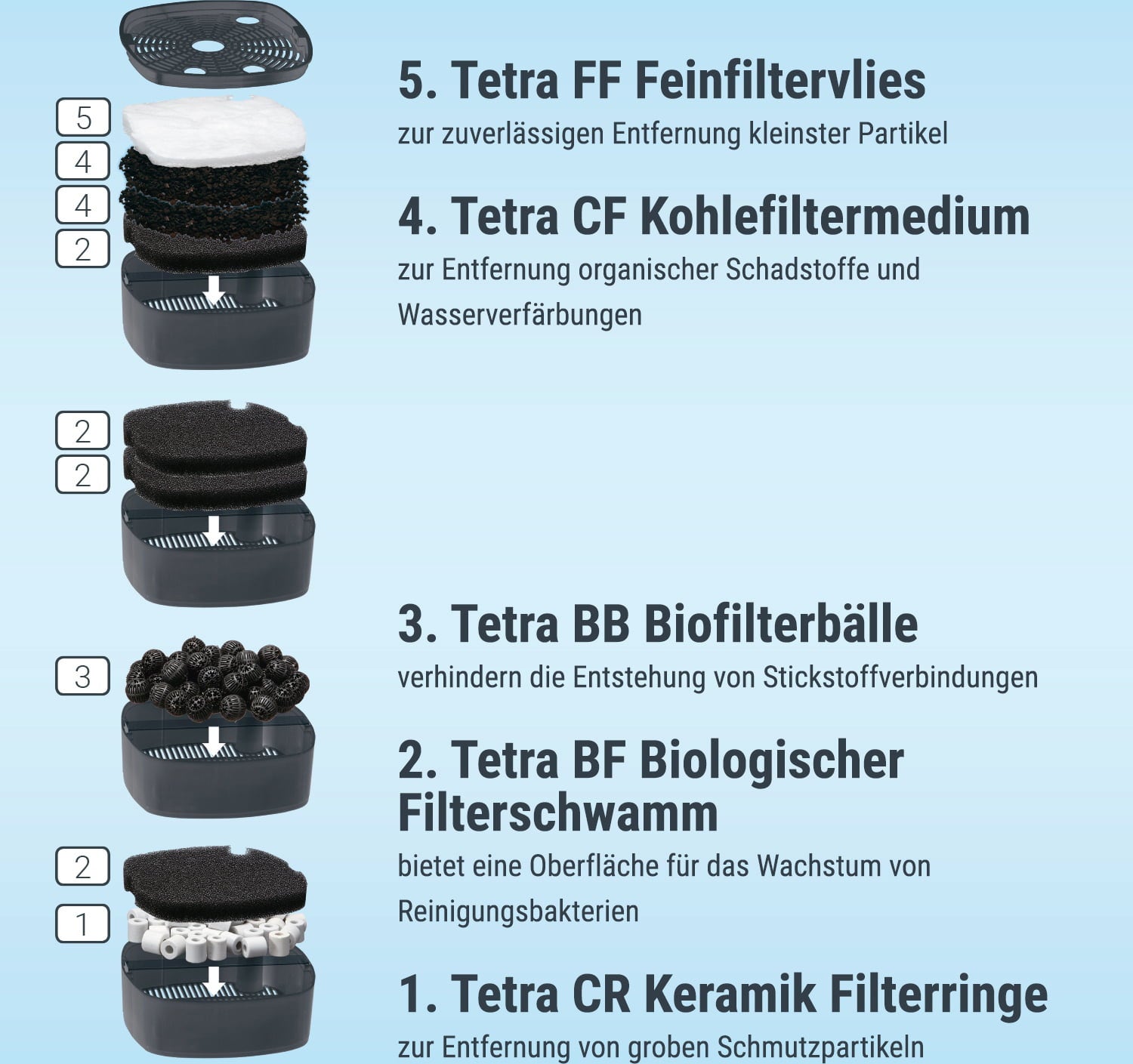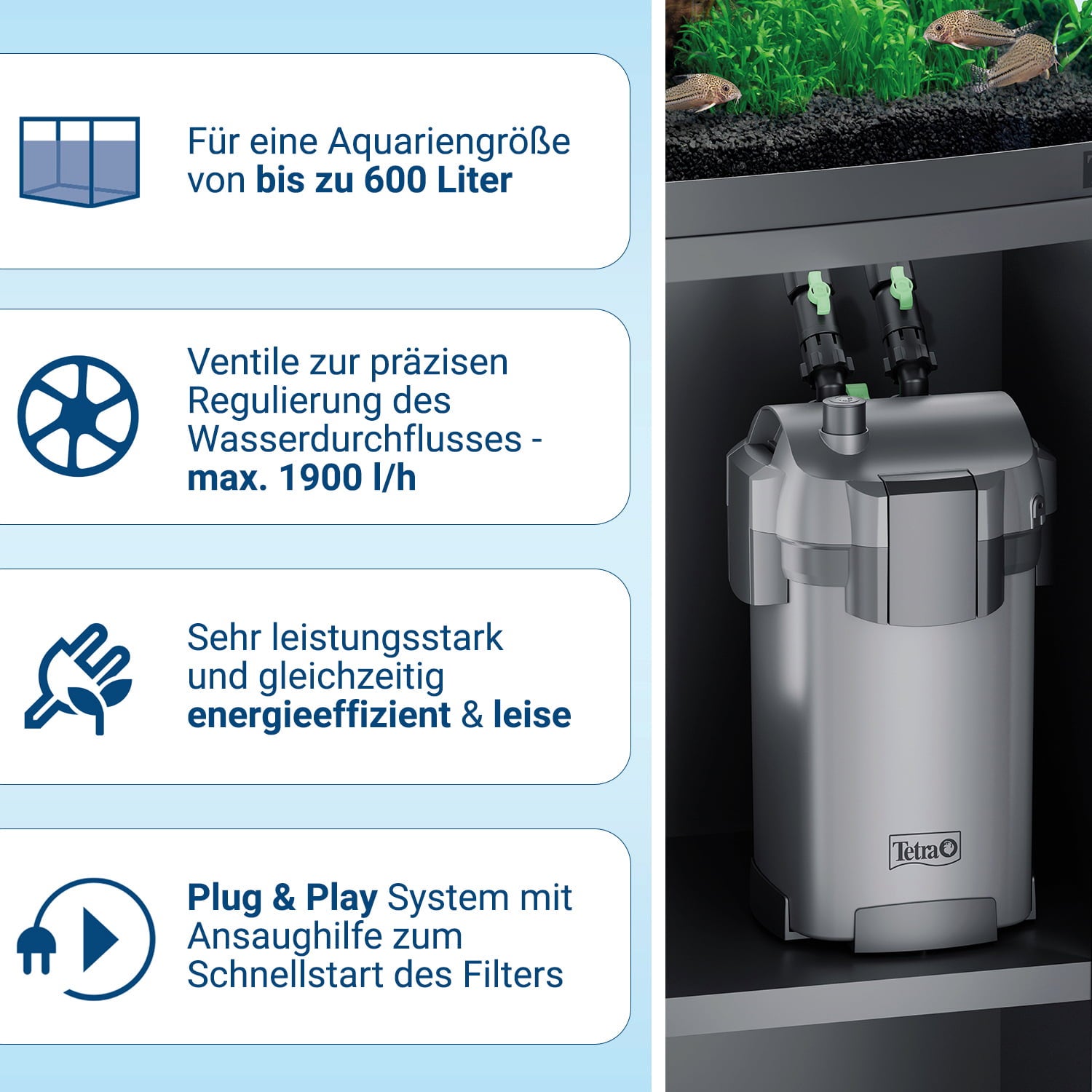 Специалната многокамерна филтърна система , която филтрира аквариумната вода до 5 пъти биологично, механично и химично, осигурява стабилни стойности на водата. Tetra предлага широка гама от различни филтърни среди. Можете да оборудвате филтъра със следната среда според вашите нужди: керамични филтърни пръстени, въглеродна филтърна среда, биологични филтърни гъби, фин филтърен флис и специални био филтърни топки.